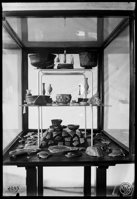 Detall d'una vitrina amb ceràmica i vidre de l'època íbero-romana el dia de la inauguració del Museu d'Història de la Ciutat. Sabadell