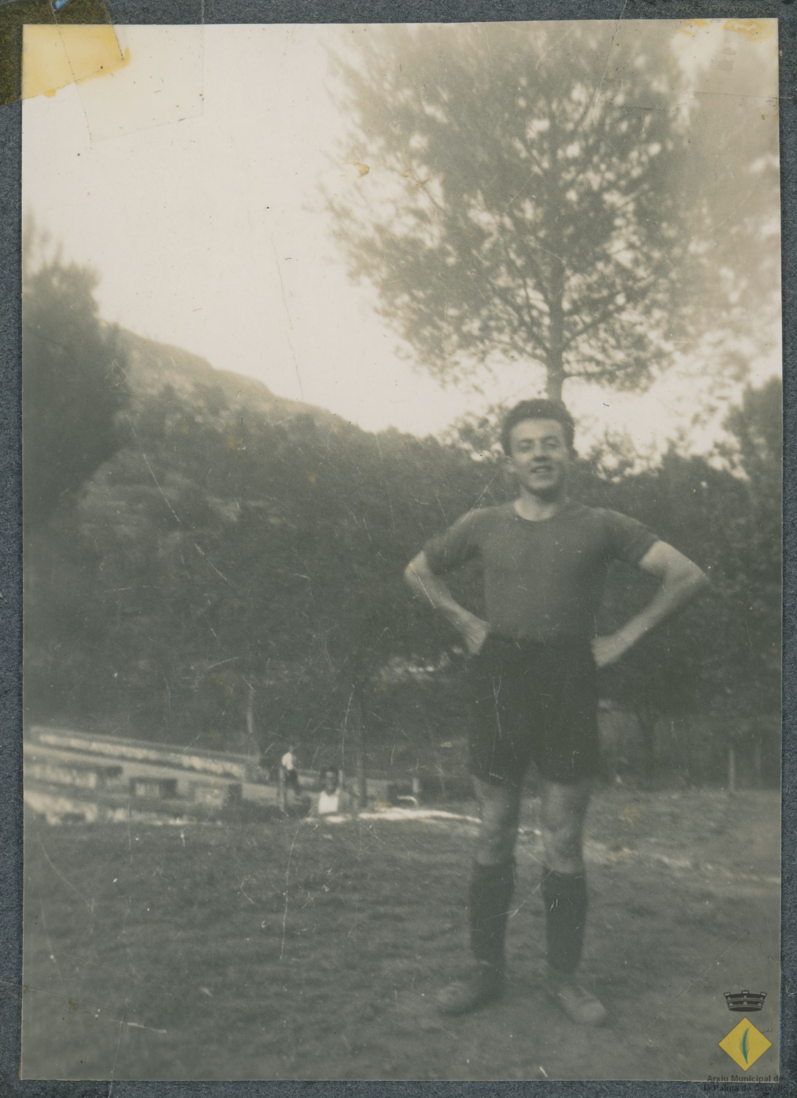 Futbolista al camp de futbol vell amb el pont sobre la riera de Rafamans al fons