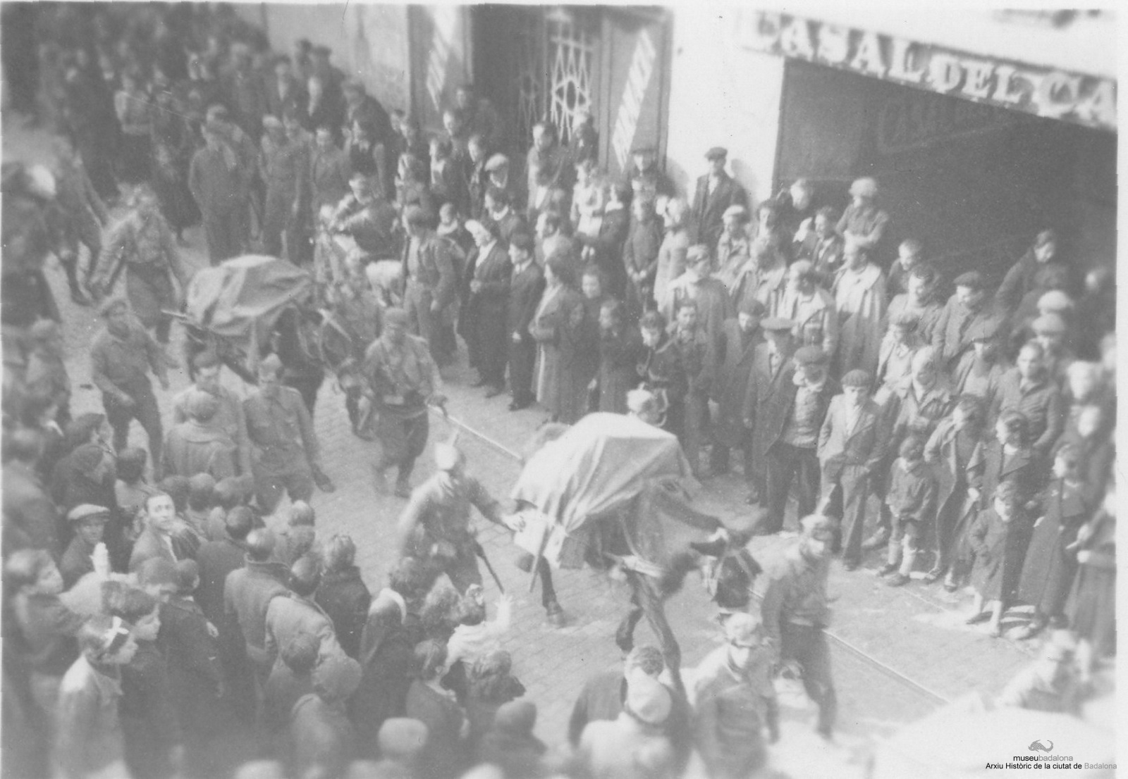 Entrada tropes nacionals a Badalona. Desfilada davant plaça de la Vila