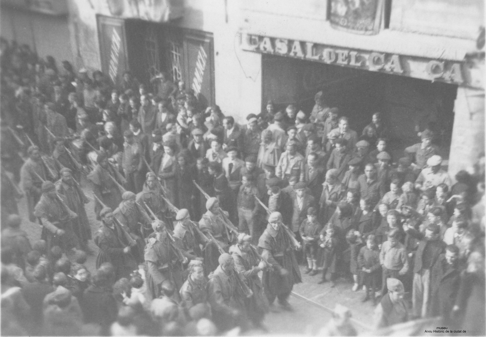 Entrada tropes nacionals a Badalona. Desfilada davant plaça de la Vila