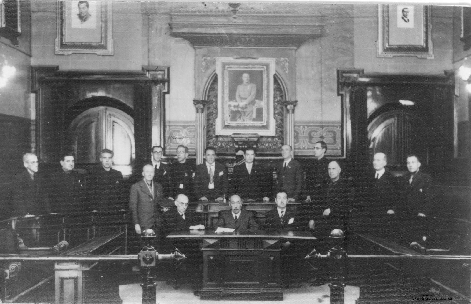 Al saló de plens, tots els membres de la Comissió gestora. Al davant: Planas, Kies i Tomàs Martí. Presideix l'alcalde Miquel Xicart