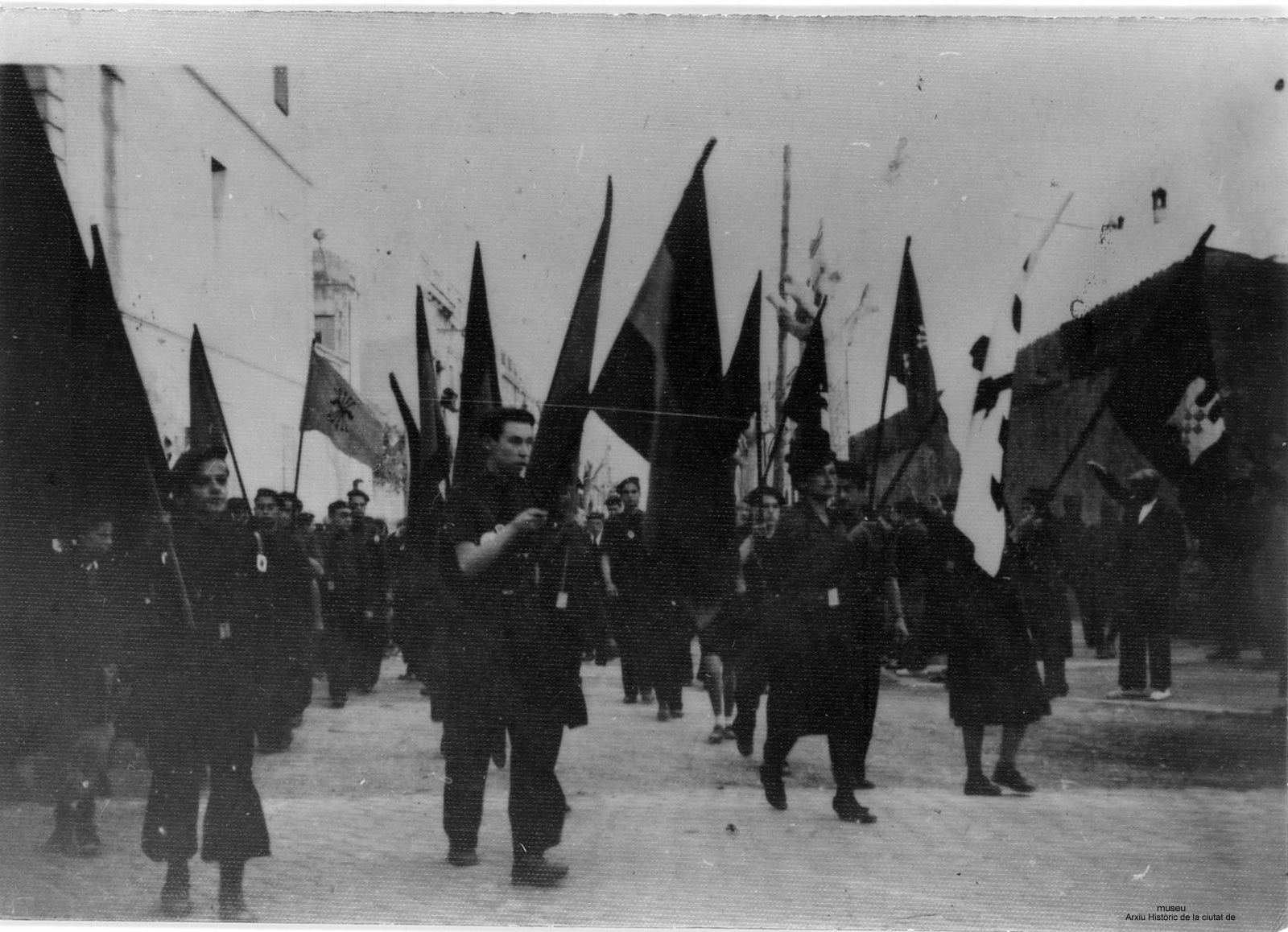 Desfilada membres de Falange al carrer, amb tota mena de banderes