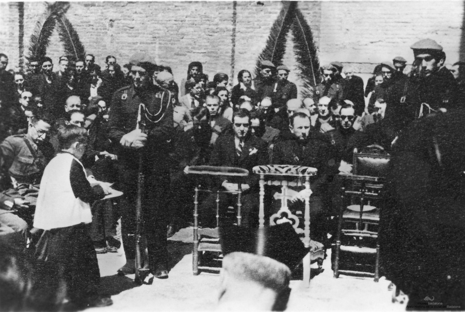 Còpia d'una fotografia. L'alcalde-gestor Miquel Xicart, Carles Parés i altre, a la primera missa celebrada al pati de l'escola dels maristes