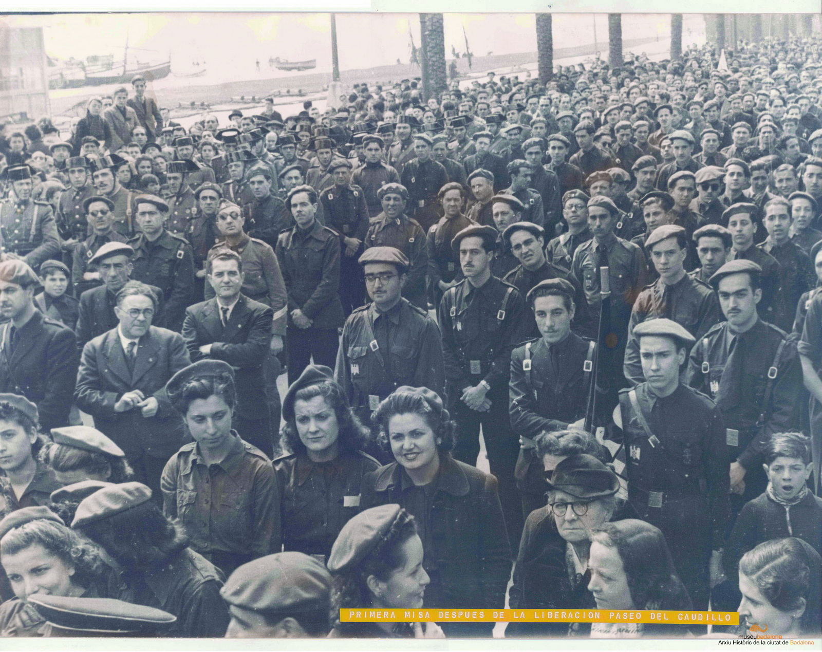 Còpia d'una fotografia. Missa de campanya a la Rambla per celebrar el primer aniversari de l'entrada de les tropes nacionals a Badalona