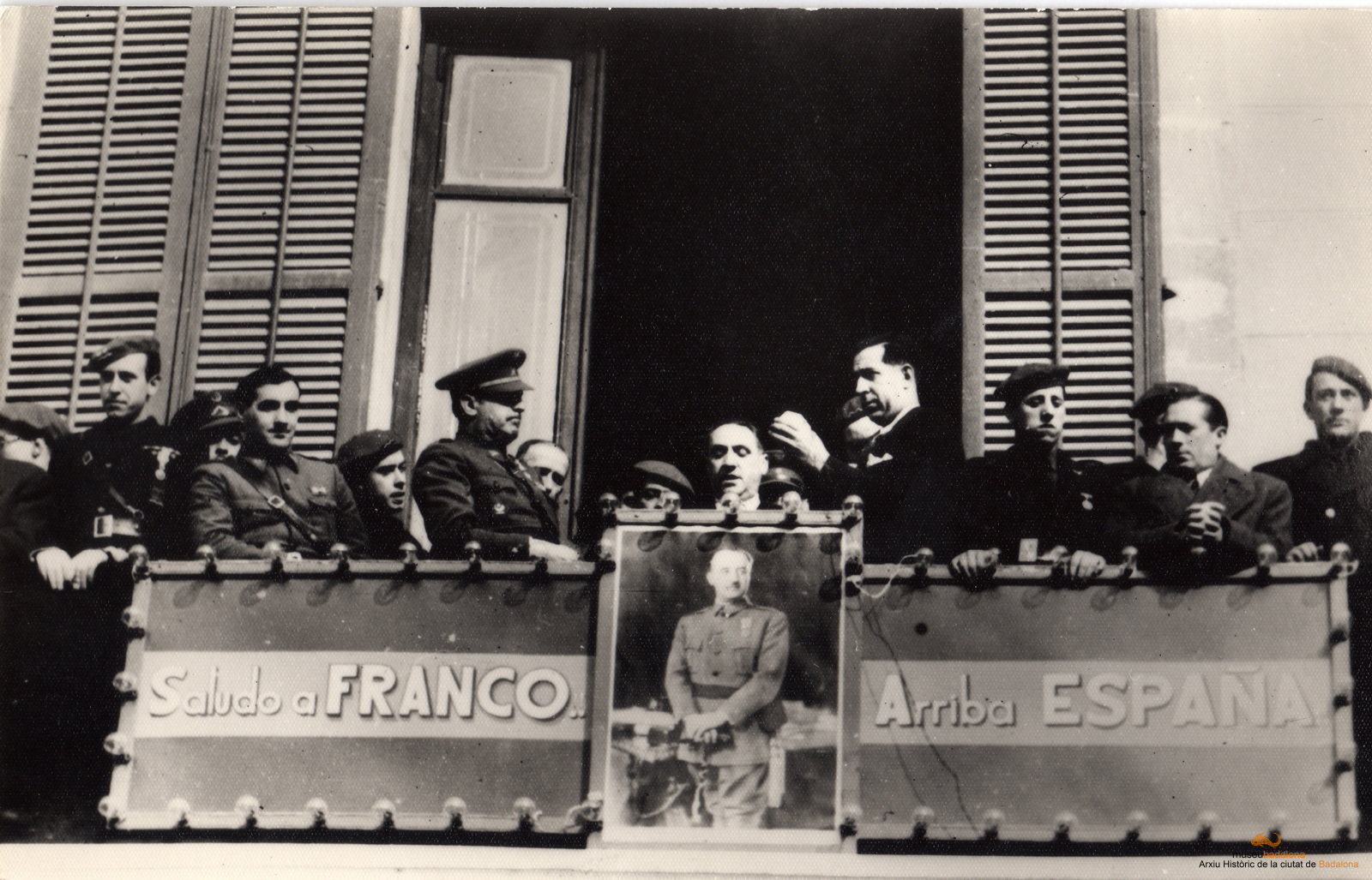 Al balcó de l'ajuntament, García Escámez (govenador militar), l'alcalde i altres, en un acte el Dia de la Joventut