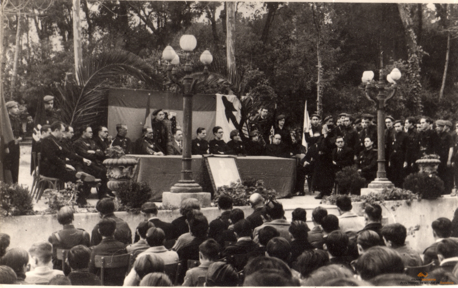 Als jardins de la torre Pi Gibert, tribuna amb gent de Falange. Acte del Dia de la Joventut