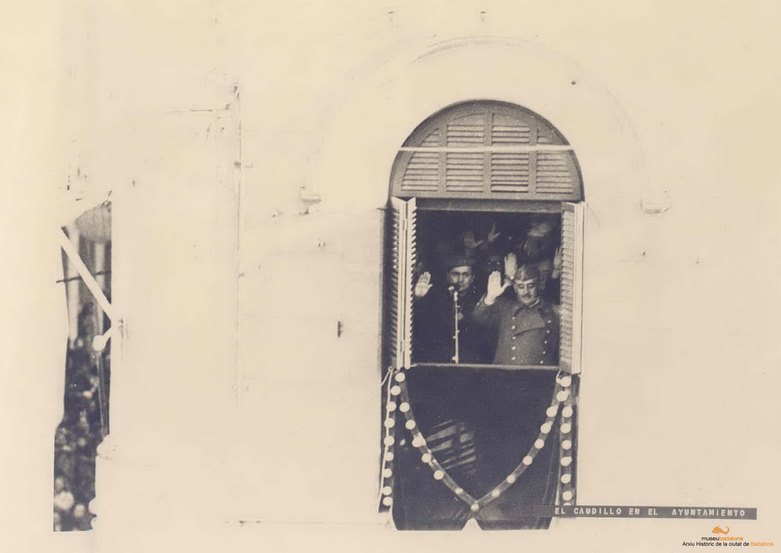 Còpia de fotografia. Pas de Franco per la ciutat. Franco, saludat des d'una finestra de l'edifici de l'Ajuntament