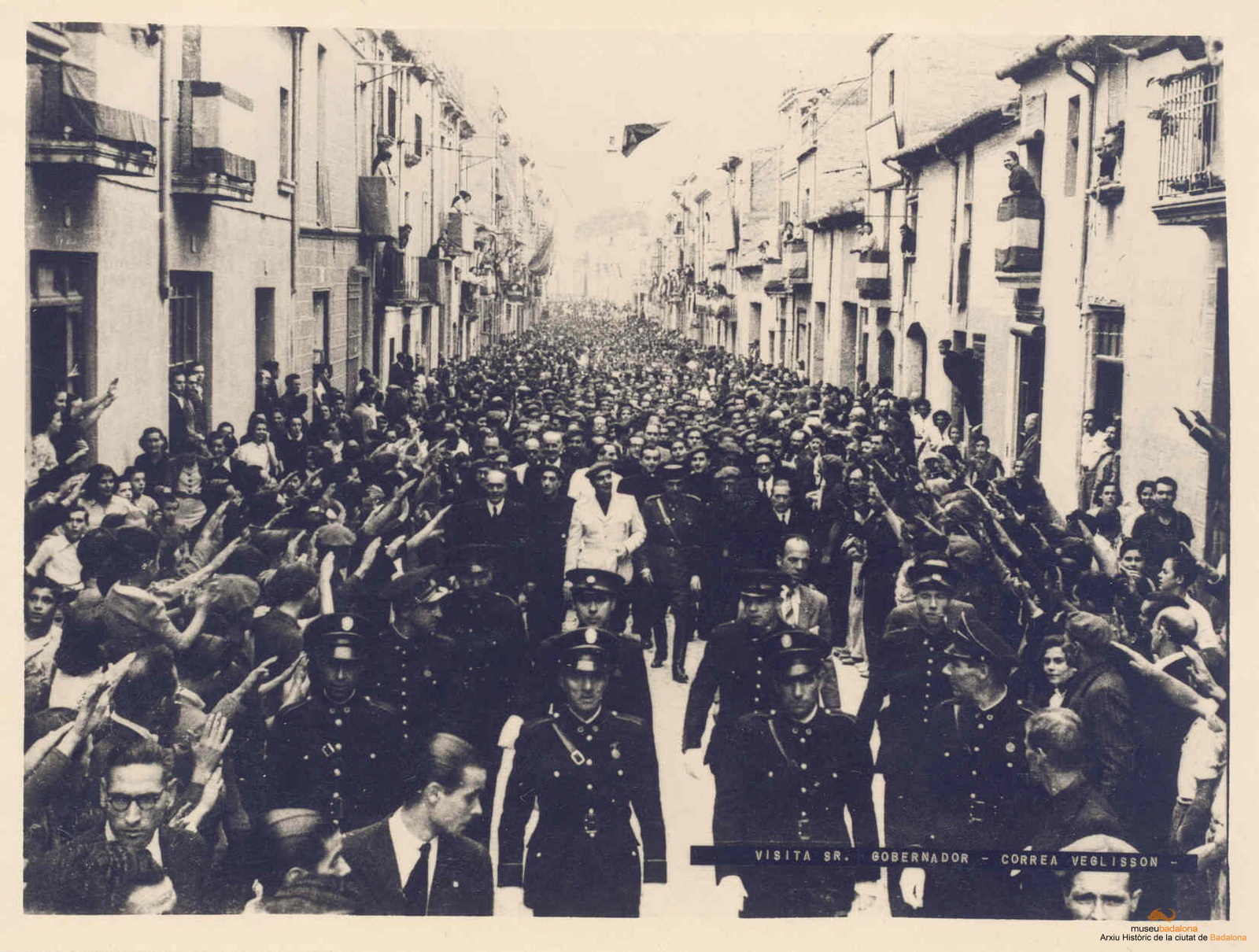 Còpia de fotografia. Visita del governador civil, Correa Veglison, a Badalona. Desfilant a peu pel carrer de la Creu