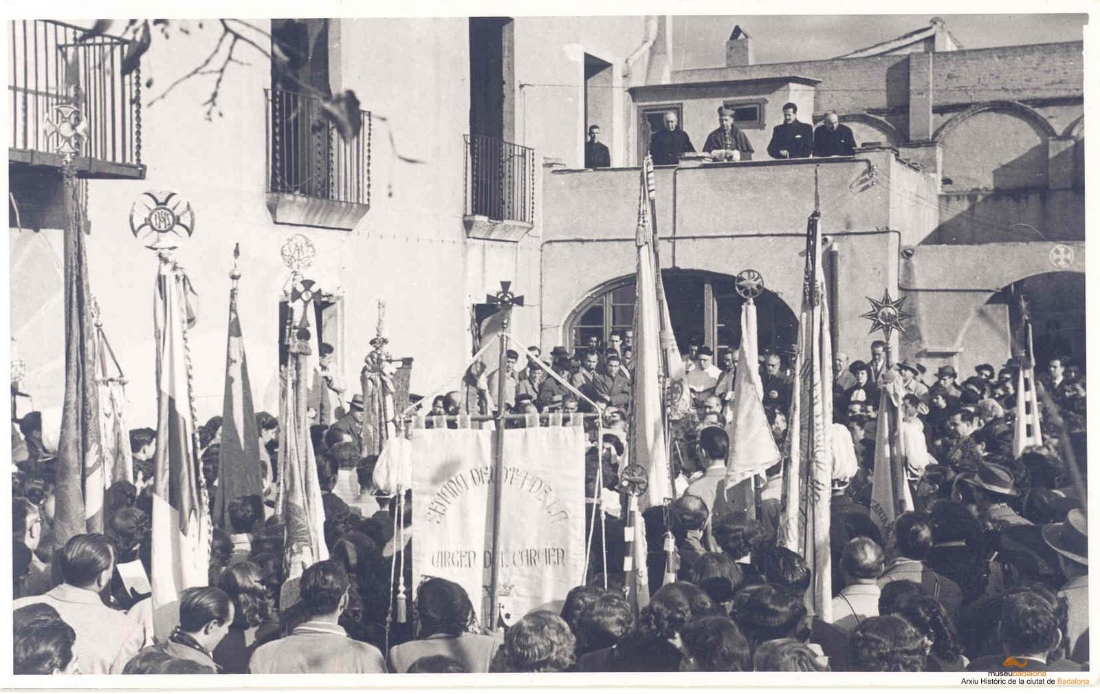 Celebració de la proclamació del dògma de fe de l'assumpció de la Mare de Déu. Pati de la rectoria de Santa Maria amb l'Orfeó Badaloní cantant i l'arxiprest de Badalona, Pere Rifé, el bisbe de Barcelona, l'alcalde Lluís Maristany i l'ecònom de Santa Maria, Francisco Roig, escoltant-lo