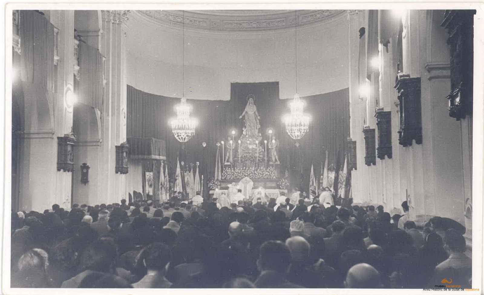 Celebració de la proclamació del dògma de fe de l'assumpció de la Mare de Déu. Interior de l'església de Santa Maria, amb el bisbe de Barcelona celebrant el pontifical.