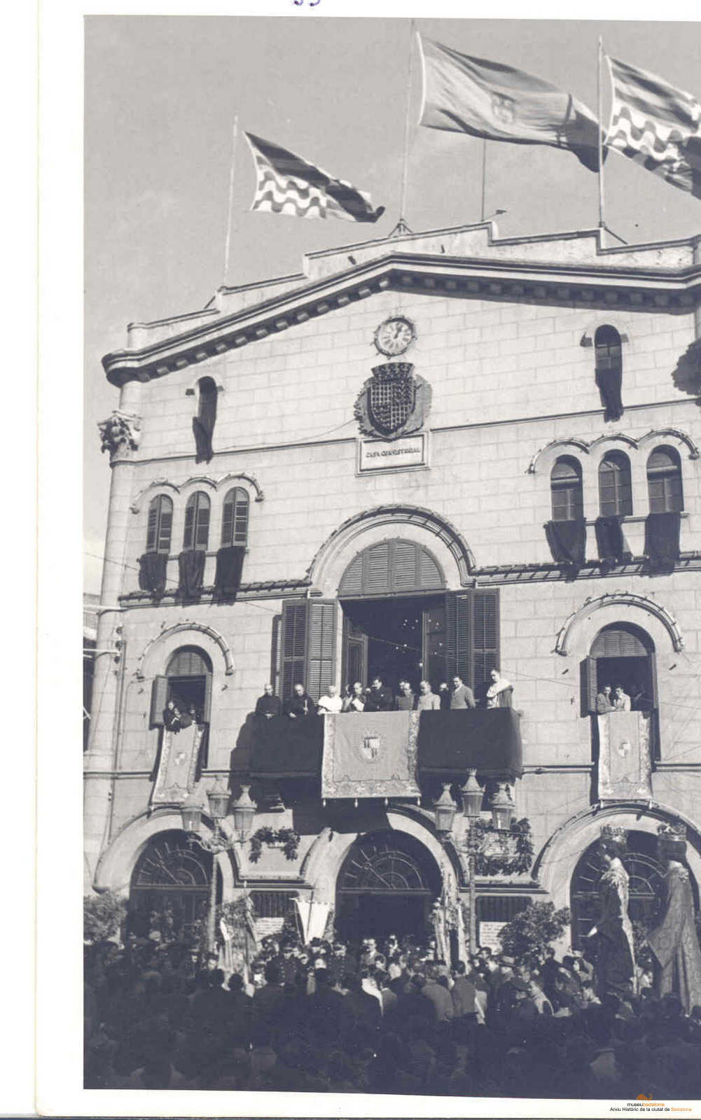 Celebració de la proclamació del dògma de fe de l'assumpció de la Mare de Déu. Des de la plaça de la Vila, l'edifici de l'ajuntament engalanat. Al balcó, el bisbe de Barcelona. A la plaça, els gegants i cors cantant