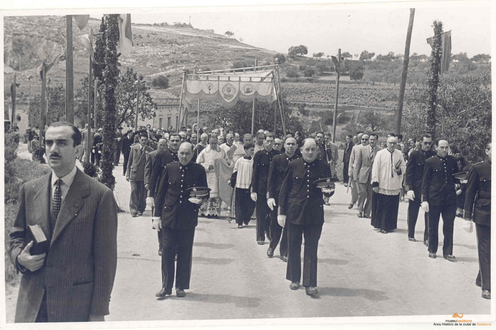 Inauguració de l'església de Sant Crist de Canyet. Per la carretera de Canyet, processó amb el bisbe traslladant el santíssim des de la capella provisional al nou temple