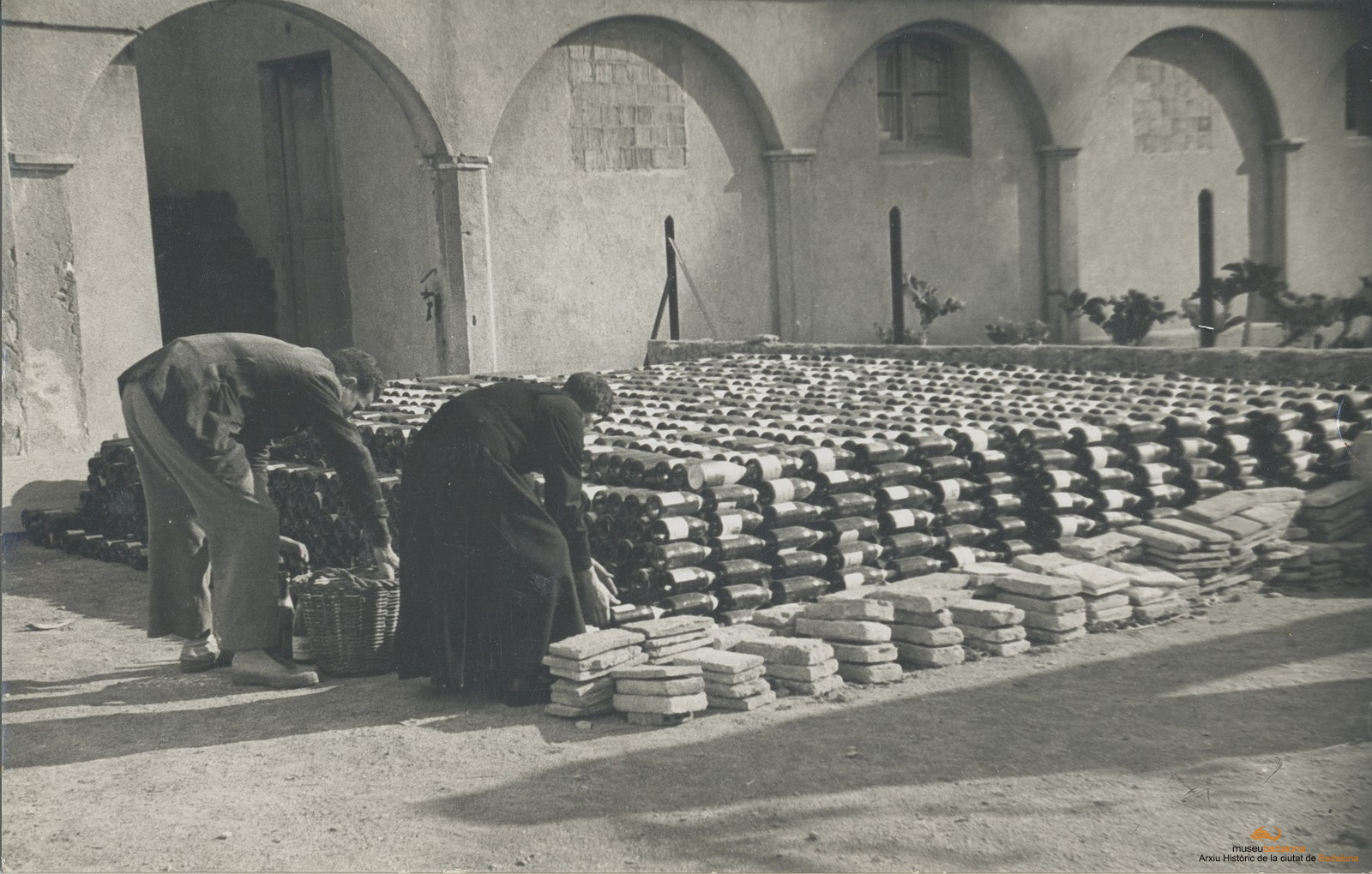 Campanya de la parròquia de Santa Maria de recollida envasos de cava. Envasos apilats al pati de la rectoria