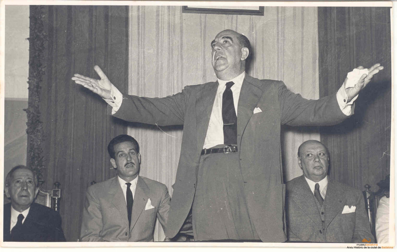 El governador civil Felipe Acedo fent un discurs en raó de la inauguració del telèfon automàtic a Badalona