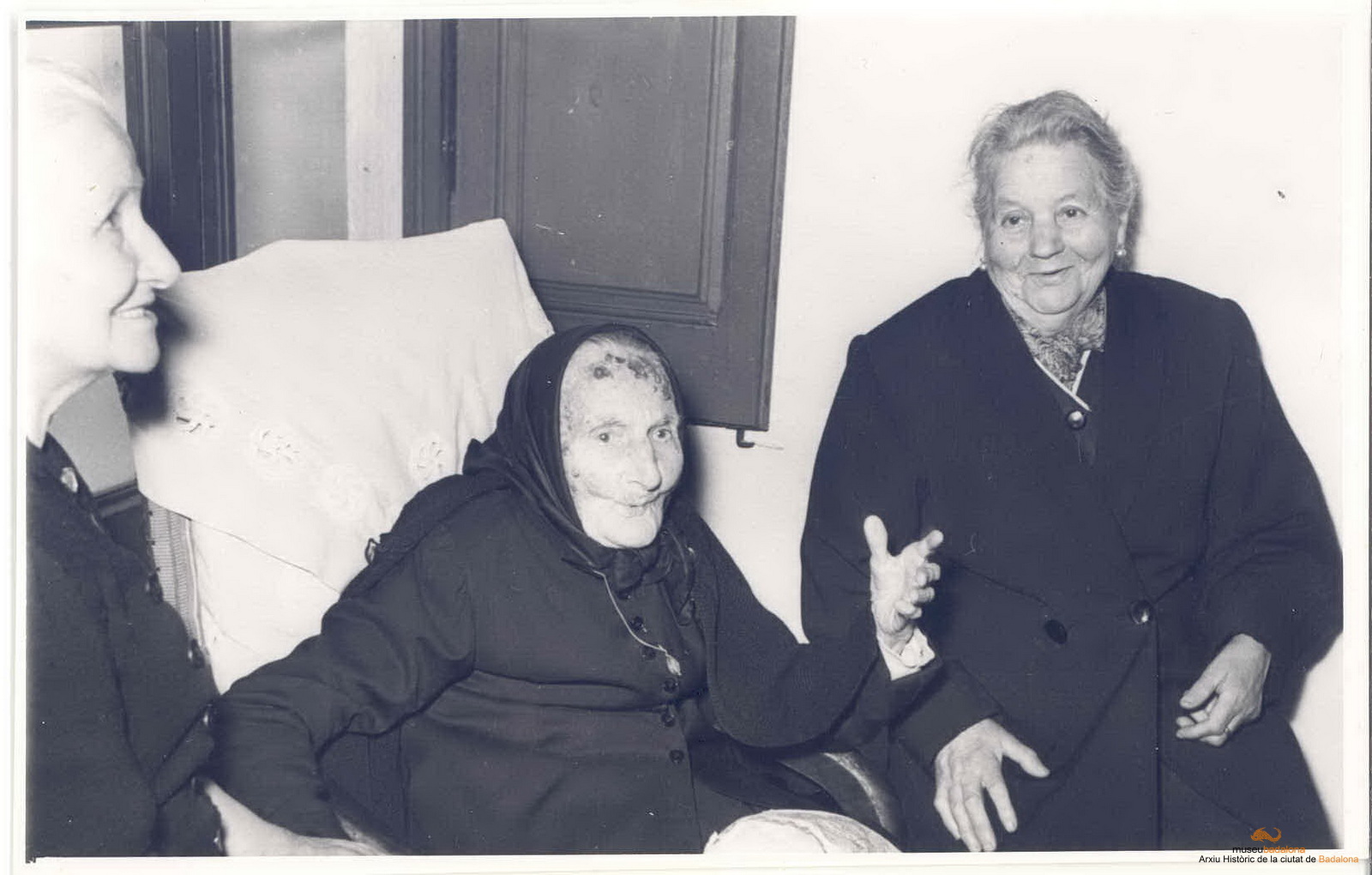 Acte dhomenatge a Madrona Estapé el seu 100 aniversari. La senyora Estapé a casa, amb dues senyores