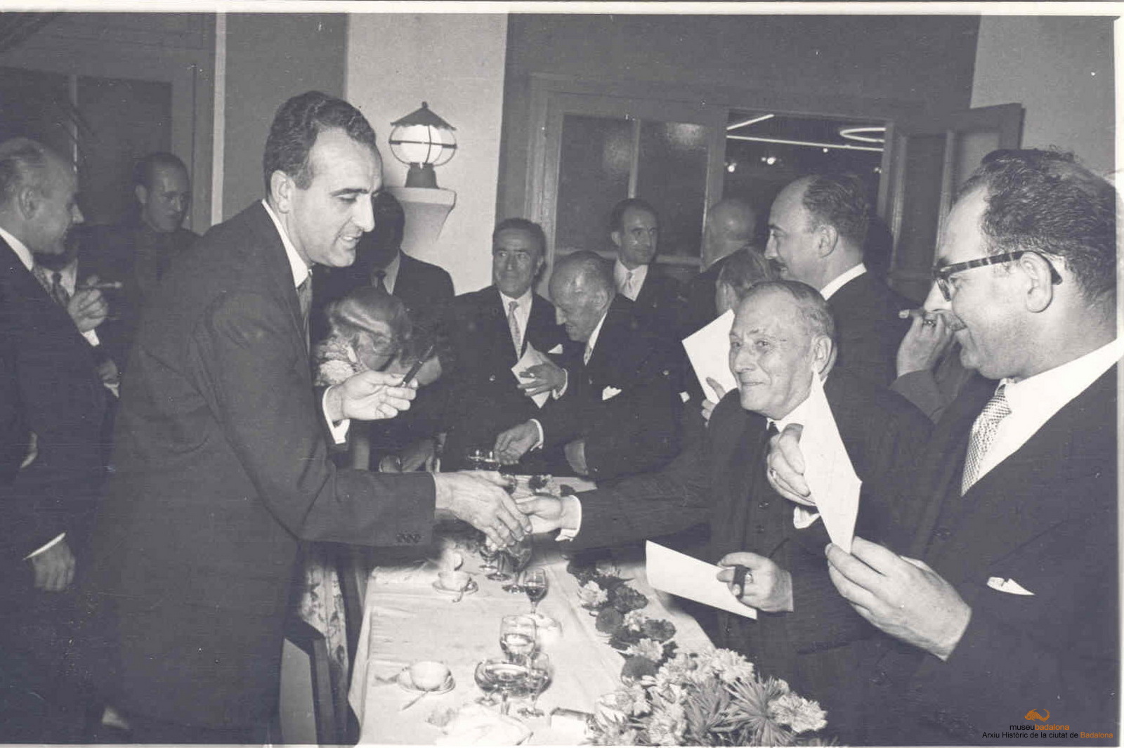 Visita del ministre d'Educació Joaquin Ruíz Giménez. El ministre Ruiz Giménez saludant a diverses persones