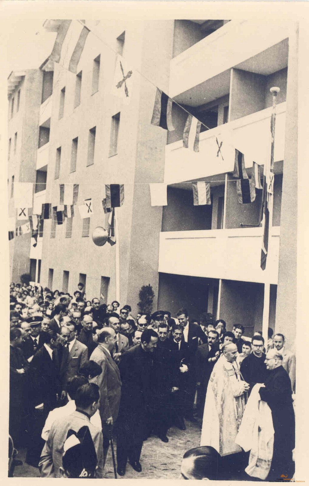 Inauguració a Bufalà dels habitatges del patronat local de Viviendas de Renta limitada. Hi ha governador civil, Felipe Acedo Colunga
