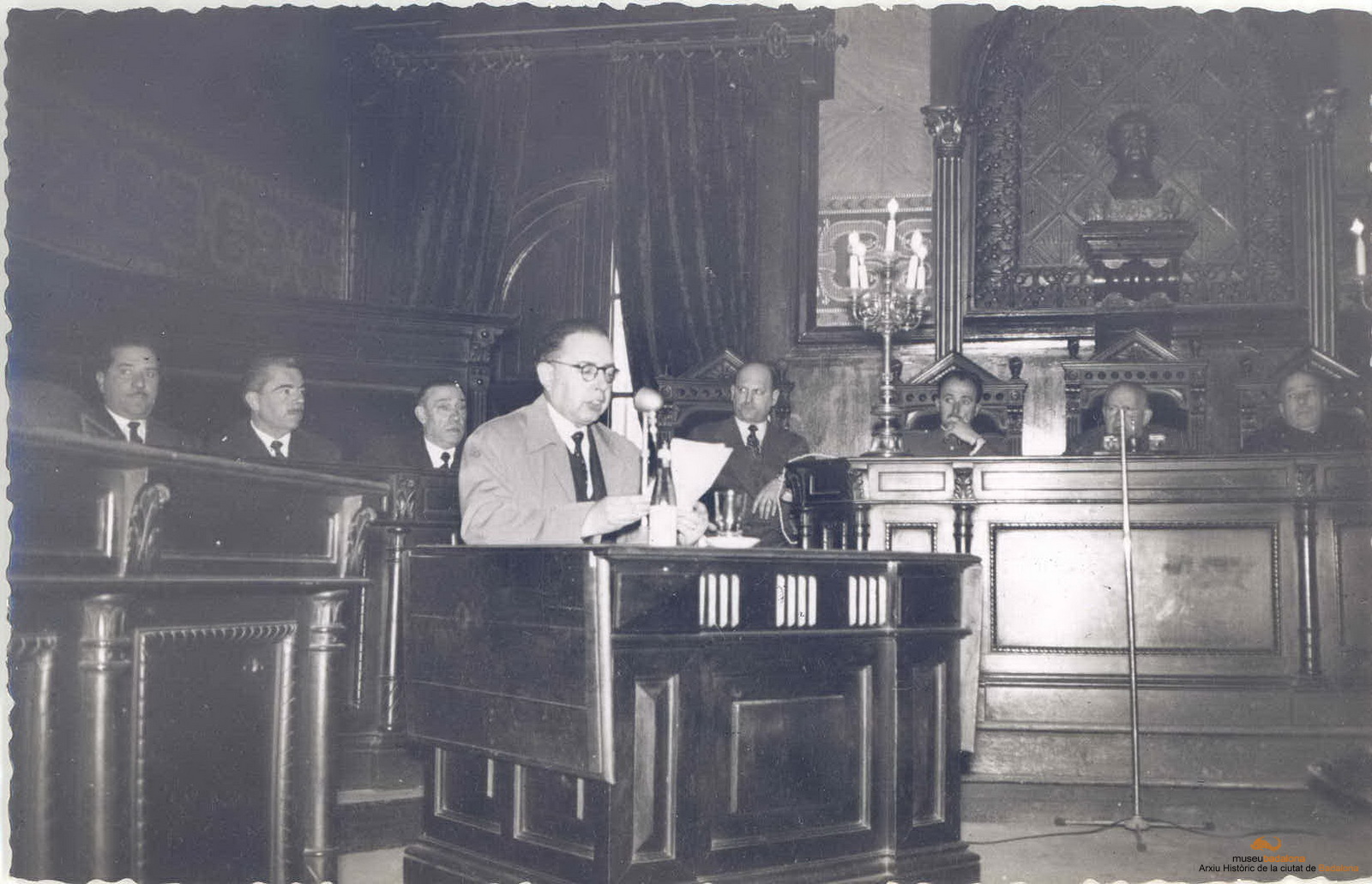 Salò de plens de l'Ajuntament. Acte homenatge a Mn. Anton Romeu. Discurs Josep M. Cuyàs