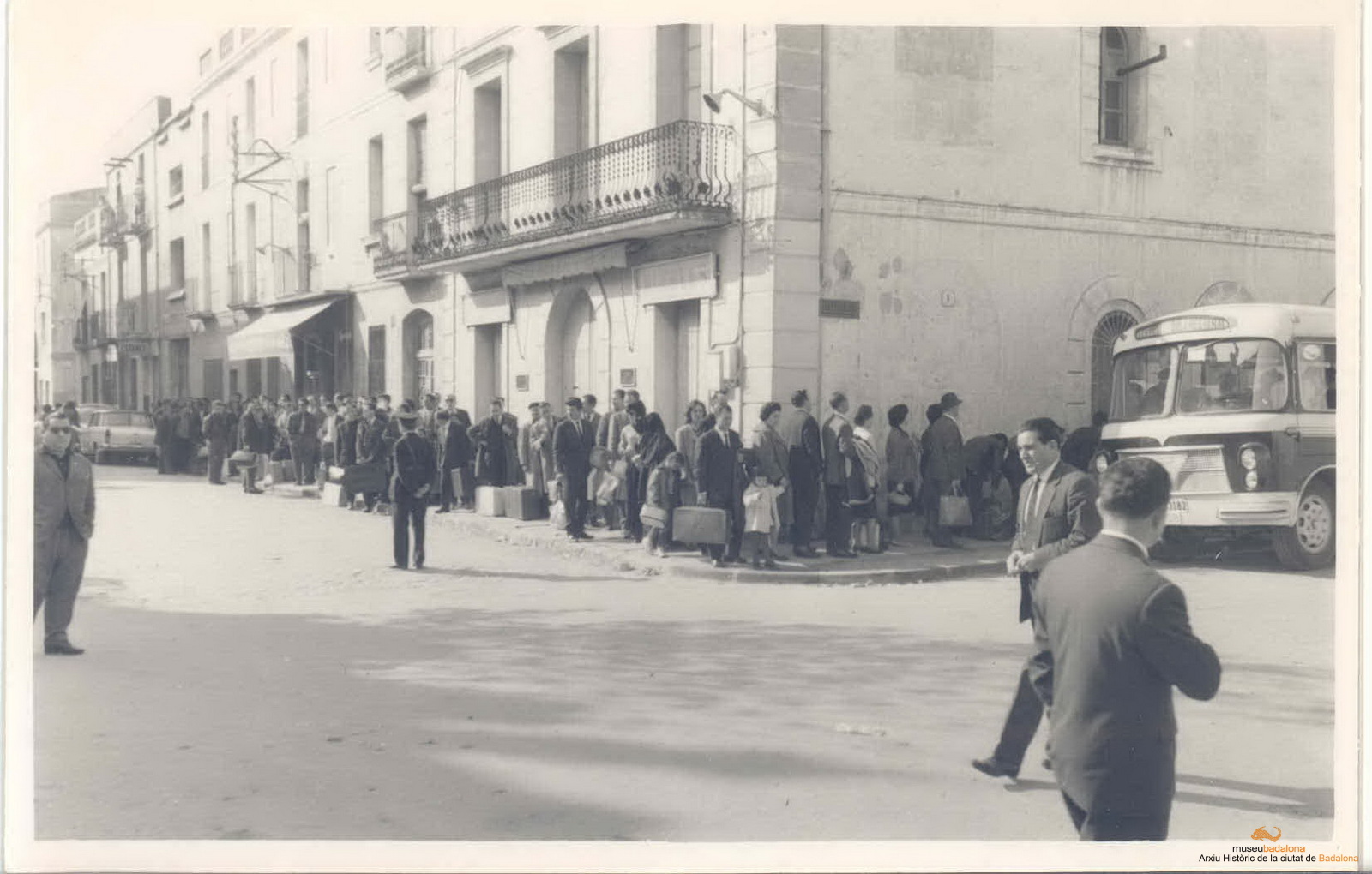 Riuada Besòs 1962. Estació de tren de Badalona com a final de trajecte. Plaça Roca i Pi. Gent fent cua esperant pujar a autocars de Renfe aparcats a l'av. Martí Pujol. Servei Badalona-Barcelona en haber-se trencat el pont del riu Besòs per la riuada
