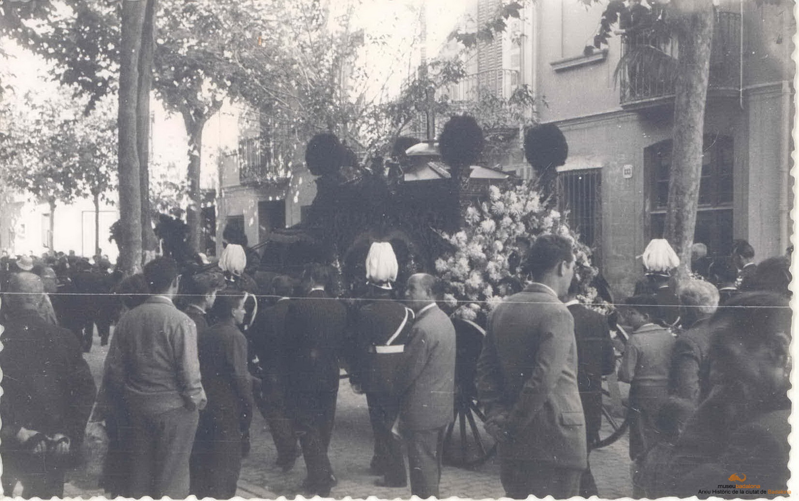 Trasllat restes Enric Borràs al cementiri de Badalona. Cotxe de morts amb les restes d'Enric Borràs al carrer Francesc Layret