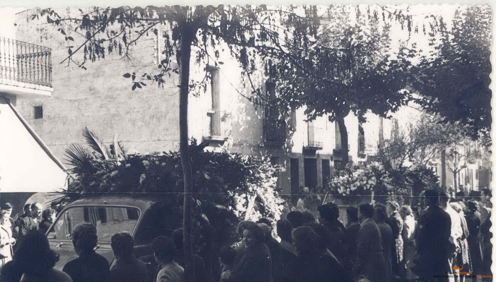 Trasllat restes Enric Borràs al cementiri de Badalona. Cotxe de morts amb les restes d'Enric Borràs al carrer d'en Prim