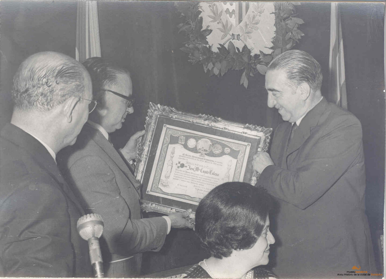 Lliurament medalla d'or de la ciutat a Josep M. Cuyàs. Garicano Goñi, governador civil de Barcelona, Felipe Antoja i Josep M. Cuyàs
