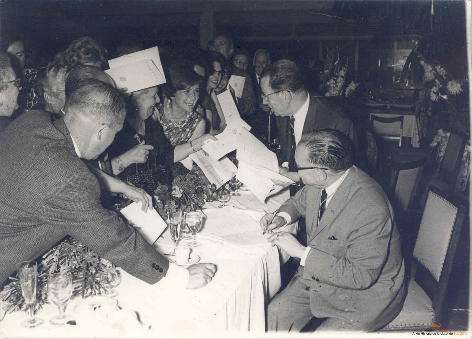 Lliurament medalla d'or de la ciutat a Josep M. Cuyàs. Grup de gent esperant que Cuyàs els signi l'imprès de l'acte