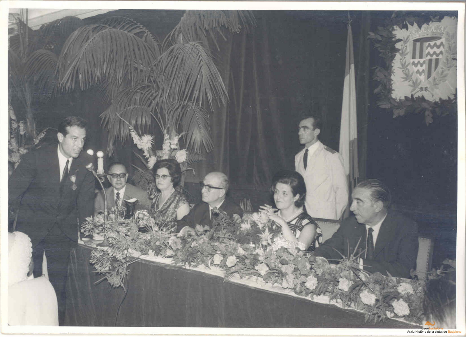 Lliurament medalla d'or de la ciutat a Josep M. Cuyàs. Es veu, d'esquerra a dreta a la taula presidencial: Josep M. Cuyàs i la seva esposa Concepció Puntí, Felipe Antoja, l'esposa de Garicano Goñi i el governador civil Garicano Goñi