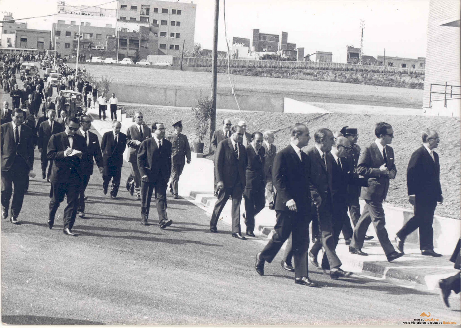 Inauguració edifici Institut Albéniz. El governador civil de Barcelona Tomás Garicano Goñi , l'alcalde Felipe Antoja i altres anant a la inauguració de l'institut Albéniz