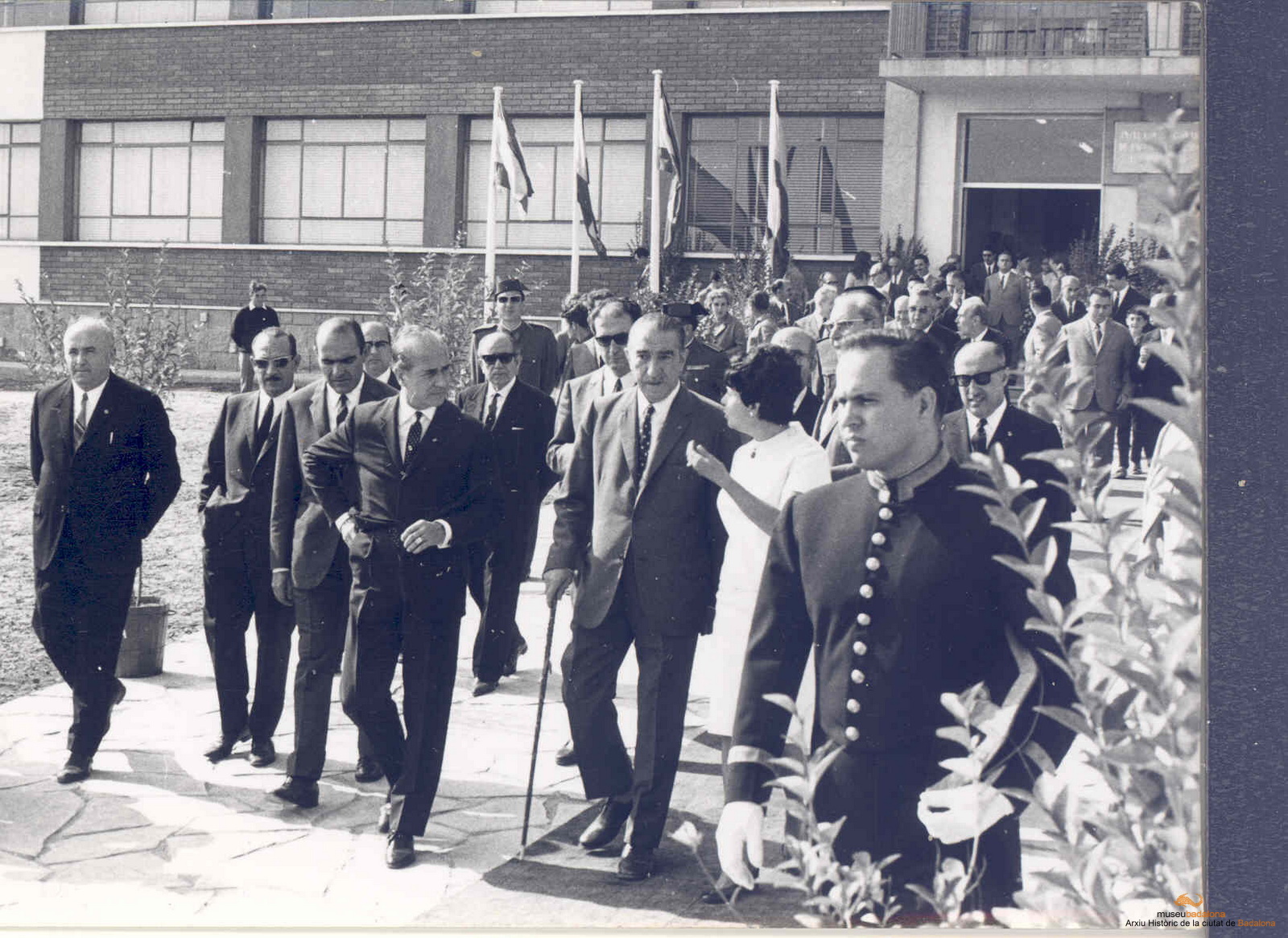 Inauguració edifici Institut Albéniz. El governador civil de Barcelona Tomás Garicano Goñi , l'alcalde Felipe Antoja i altres a la sortida de l'institut Albéniz després de la inauguració