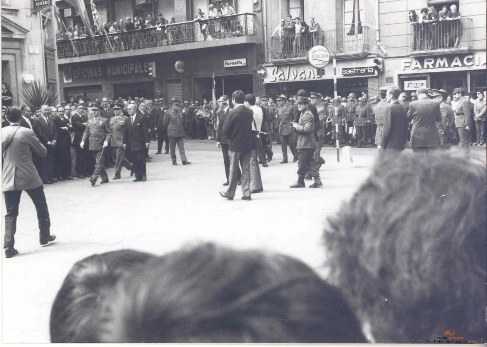 Visita del Capità General per condecorar lalcalde Felip Antoja amb la Creu del Mèrit militar. Passant revista a les tropes a la plaça de la Vila