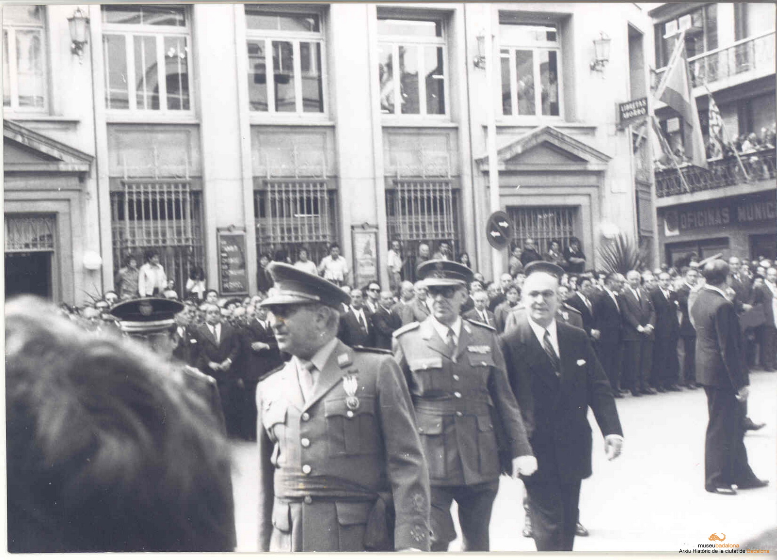 Visita del Capità General per condecorar lalcalde Felip Antoja amb la Creu del Mèrit militar. Passant revista a les tropes a la plaça de la Vila