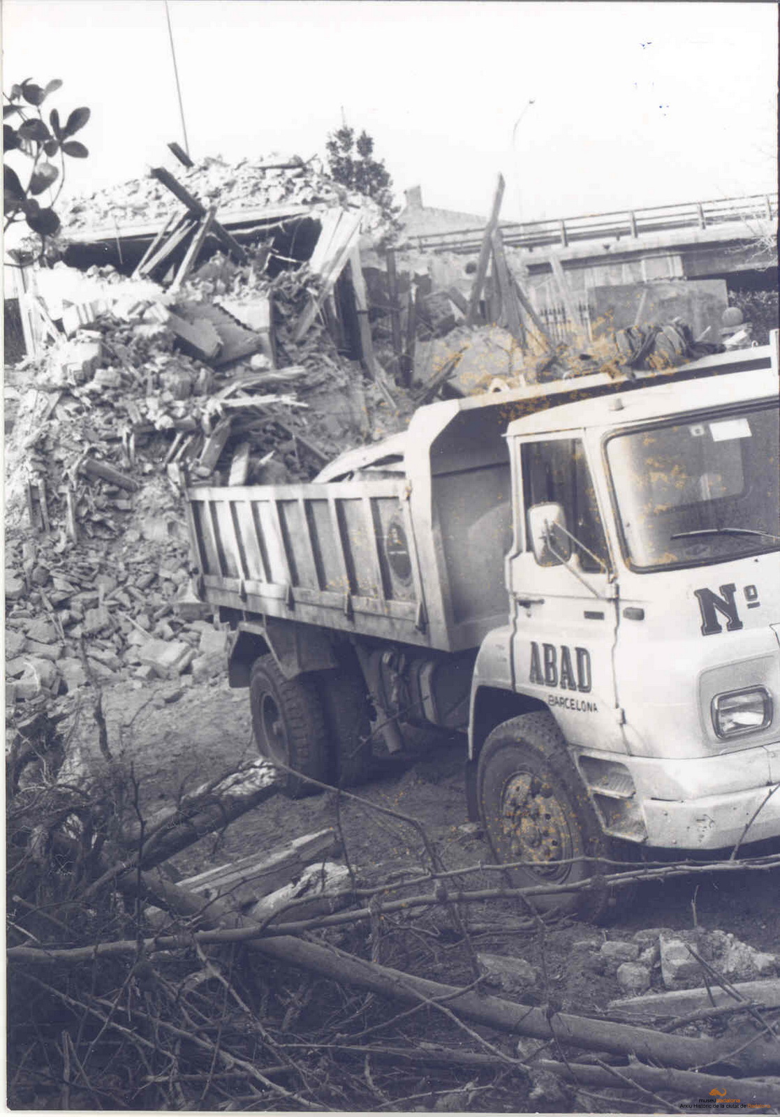 Enderroc de l'edifici de Can Pi Gibert. Camió recollint restes de l'enderroc