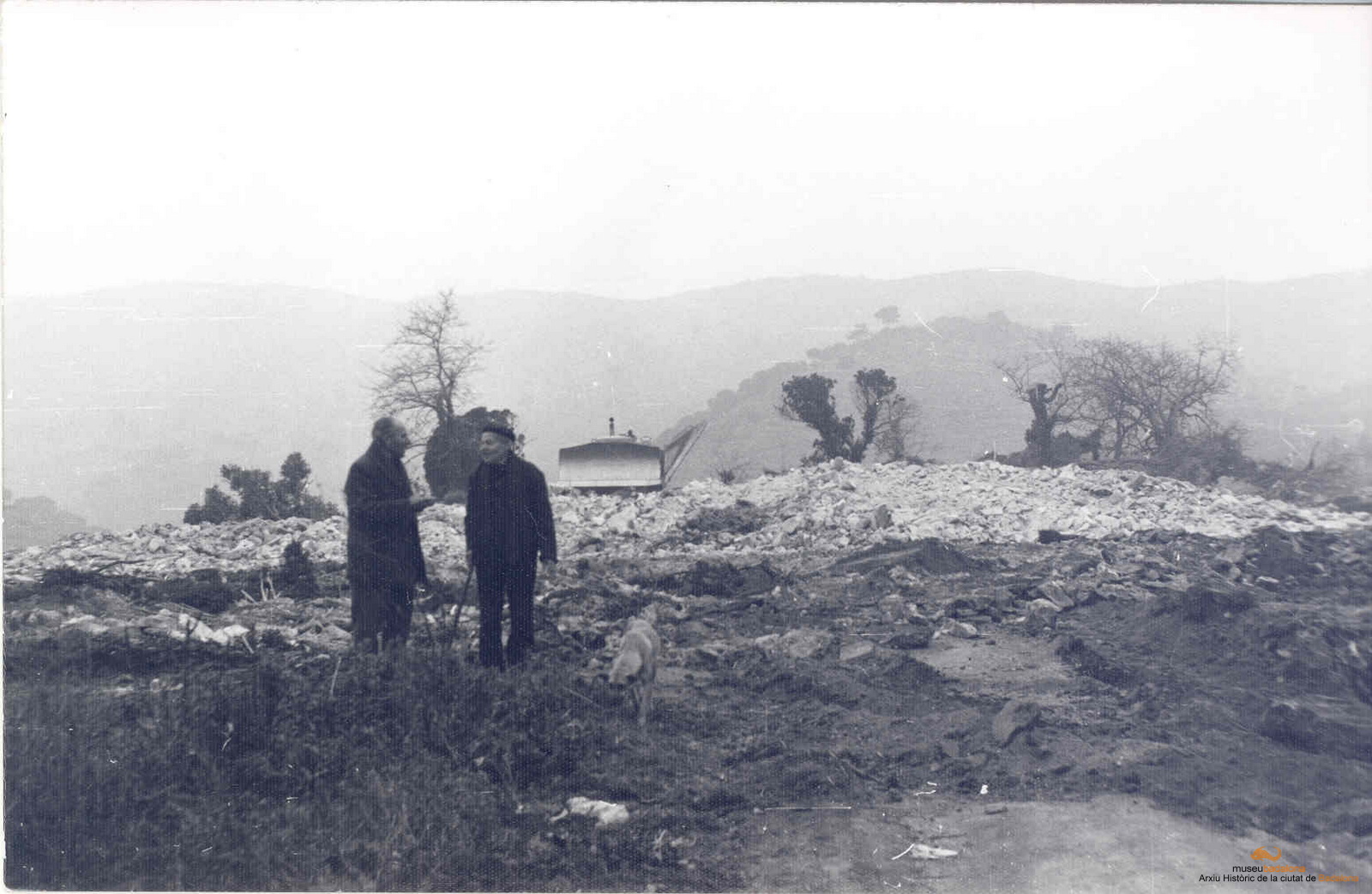 Enderroc de la masia de Can Ruti. Vista general de la zona amb una màquina enderrocant les parets