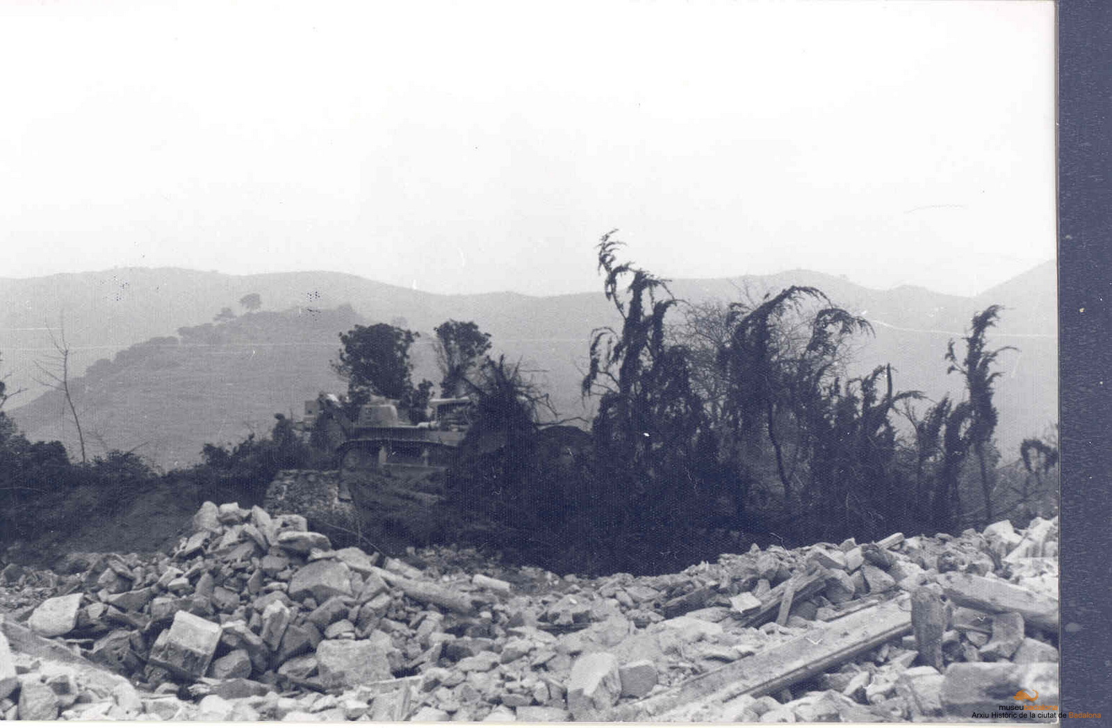 Enderroc de la masia de Can Ruti. Vista general de la zona amb una màquina enderrocant les parets