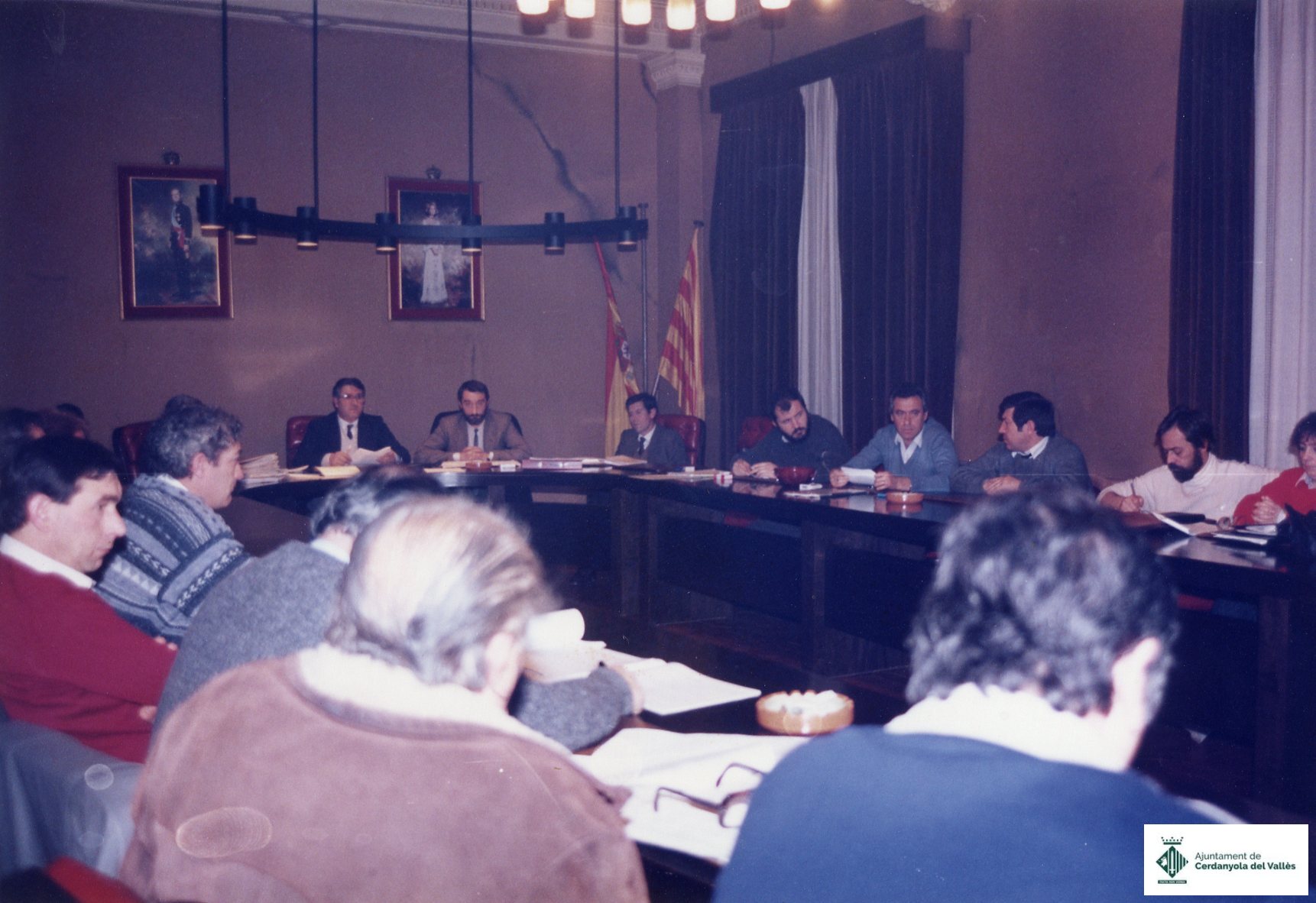 Sessió de la Sala de Plens de l'Ajuntament de Cerdanyola el Vallès amb els regidors celebrada l'any 1983 durant el transcus del segon mandat de l'alcalde Celestino Sánchez (Partit Socalista de Catalunya)