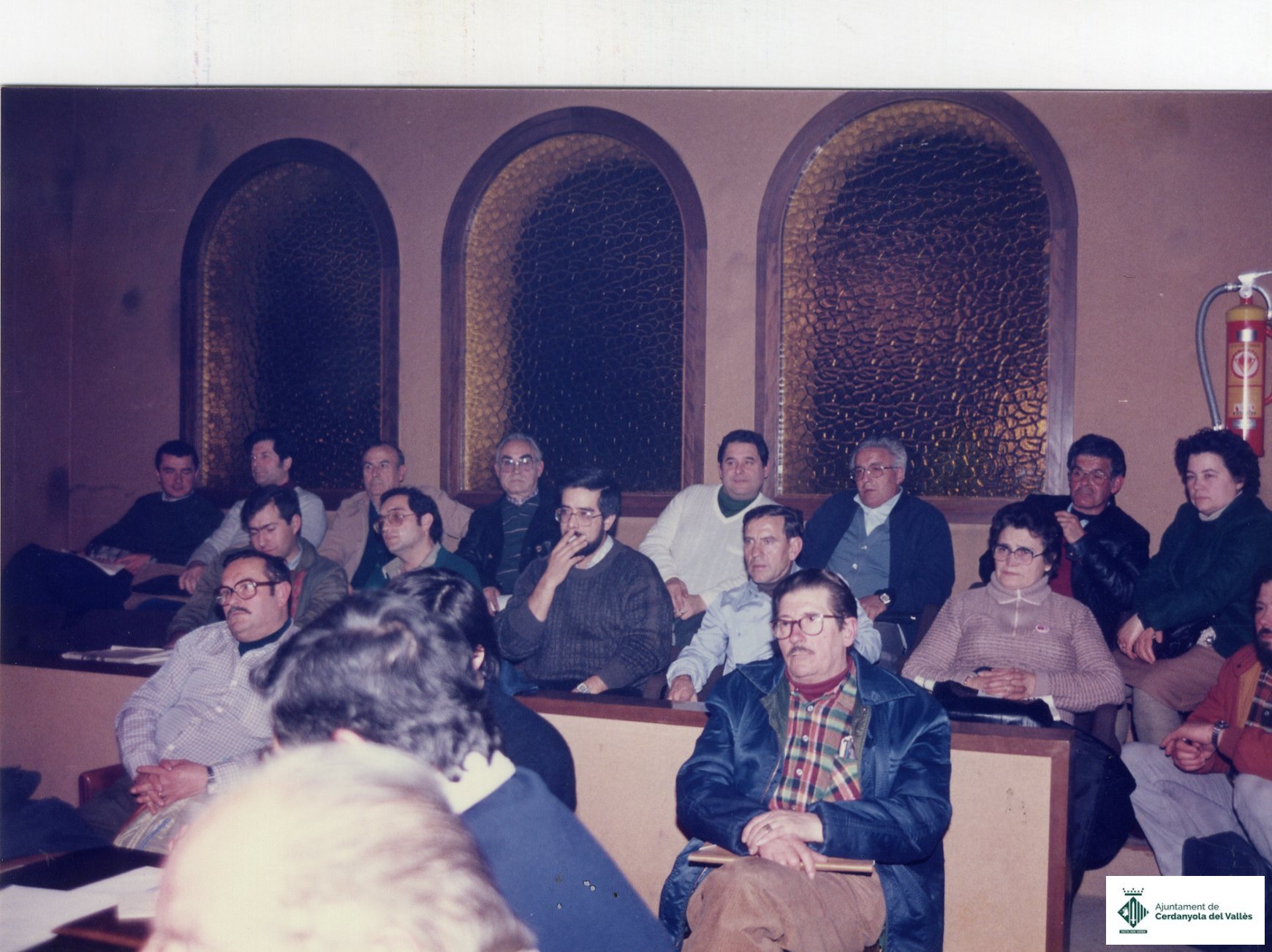 Sessió de la Sala de Plens de l'Ajuntament de Cerdanyola el Vallès amb els regidors celebrada l'any 1983 durant el transcus del segon mandat de l'alcalde Celestino Sánchez (Partit Socalista de Catalunya)
