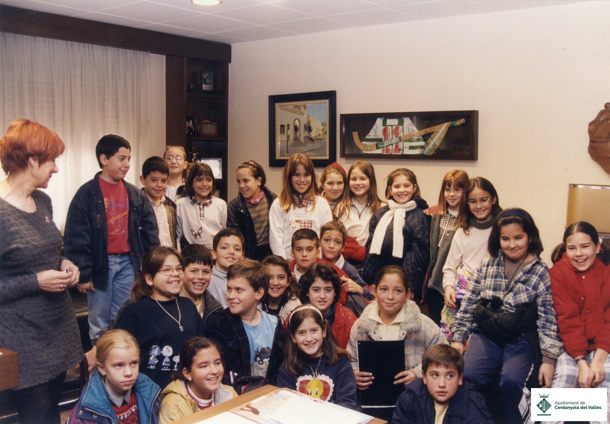 L'Alcaldesa Cristina Real Masdeu rep la visita d'un grup d'escolars de primària d'un centre d'ensenyament no identificat al despatx d'alcaldia de l'Ajuntament de Cerdanyola del Vallès el febrer de 1998