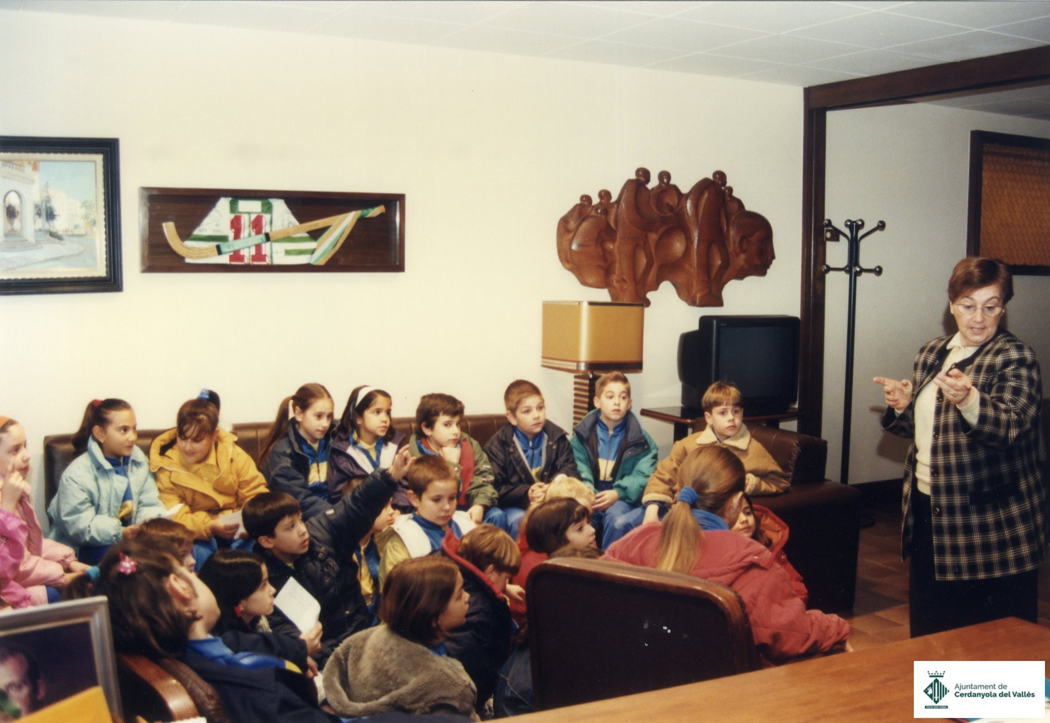 L'Alcaldesa Cristina Real Masdeu rep la visita d'un grup d'escolars de primària d'un centre d'ensenyament no identificat al despatx d'alcaldia de l'Ajuntament de Cerdanyola del Vallès el febrer de 1998