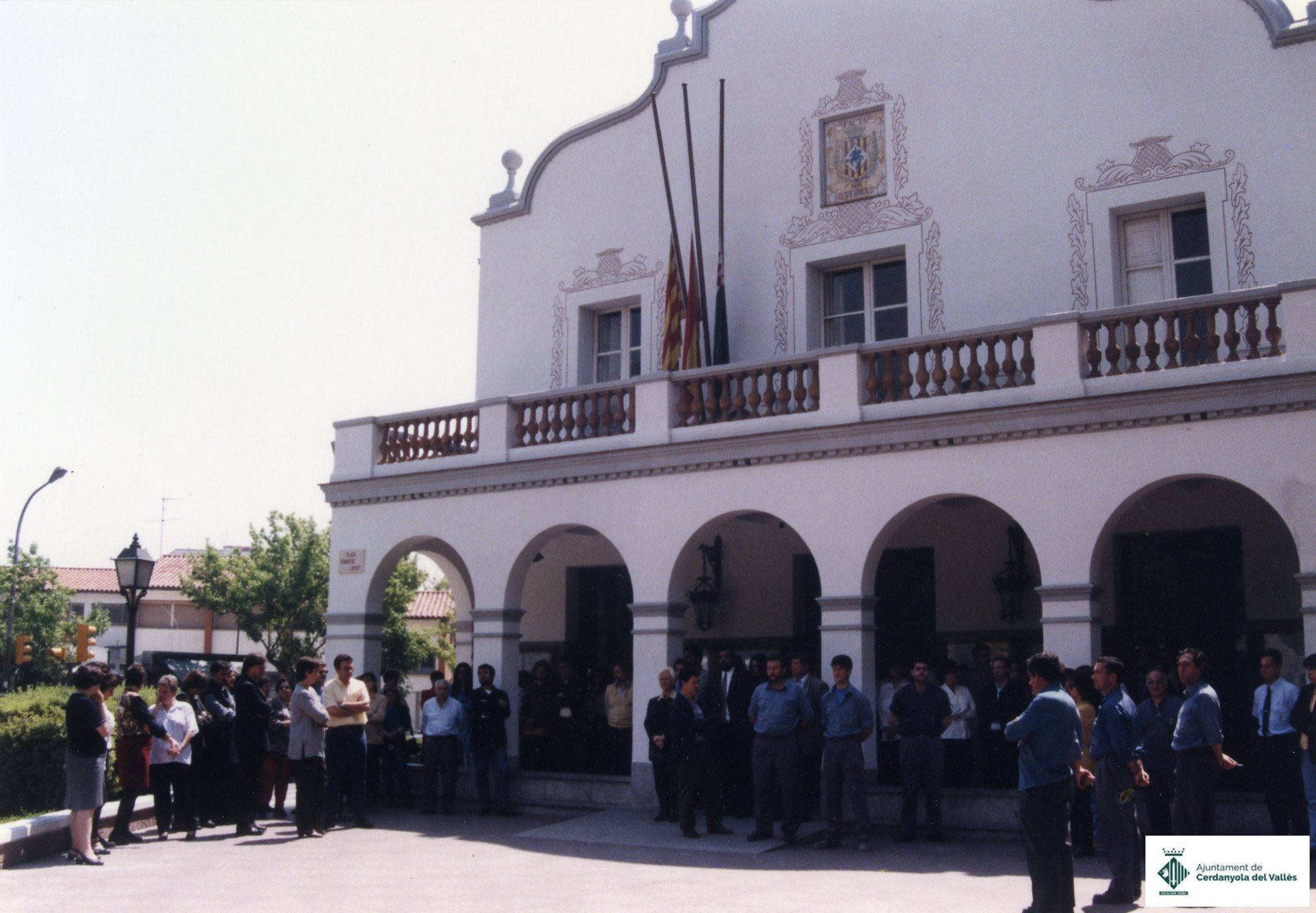Els membres del consistori fan un minut de silenci devant l'edifici de l'Ajuntament de Cerdanyola del Vallès en rebuig a la banda terrorista ETA el maig de 1998