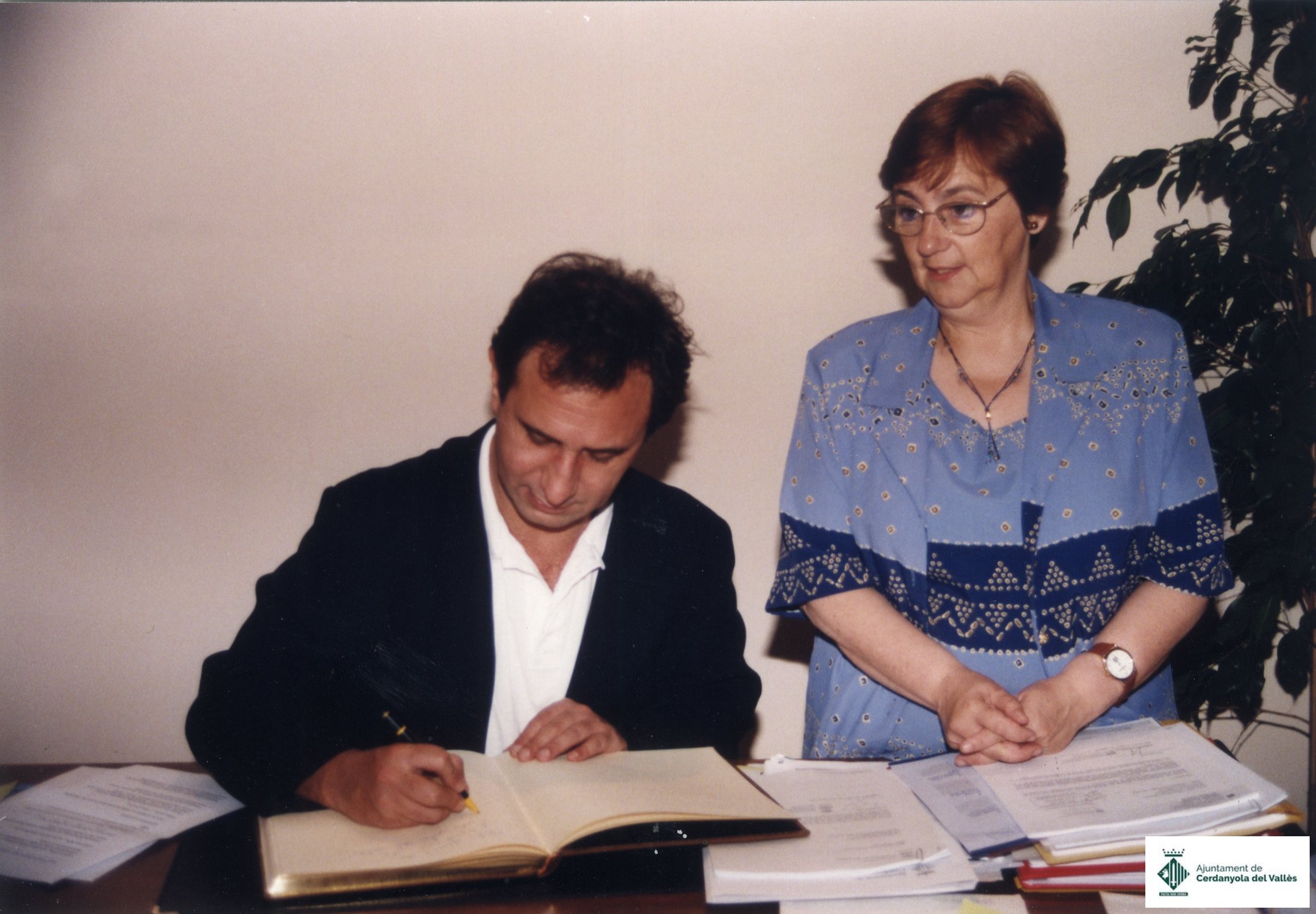 Acte de signatura del Llibre d'Honor de l'Ajuntament de Cerdanyola del Vallès del periodista Pitu Abril amb l'alcaldesa de Cerdanyola del Vallès Cristina Real Masdeu el maig de 1998