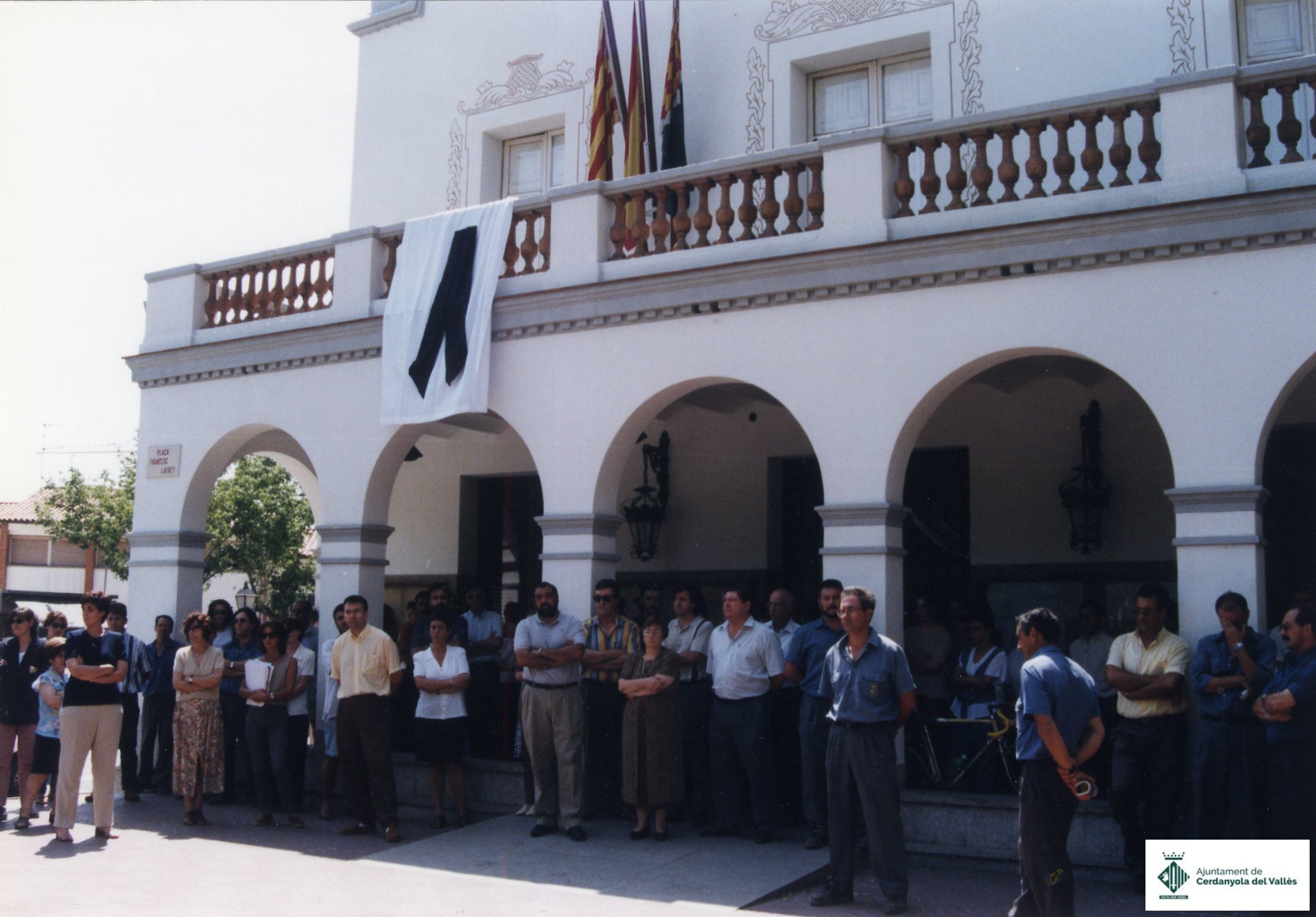 El personal del consistori, encapçalat per l'alcaldesa Cristina Real Masdeu, es concentra devant l'edifici de l'Ajuntament de Cerdanyola del Vallès en rebuig a l'assassinat de Manuel Francisco Zamarreño Villoria, regidor del Partit Popular per l'Ajuntament de Rentería, a mans d'ETA el juny de 1998