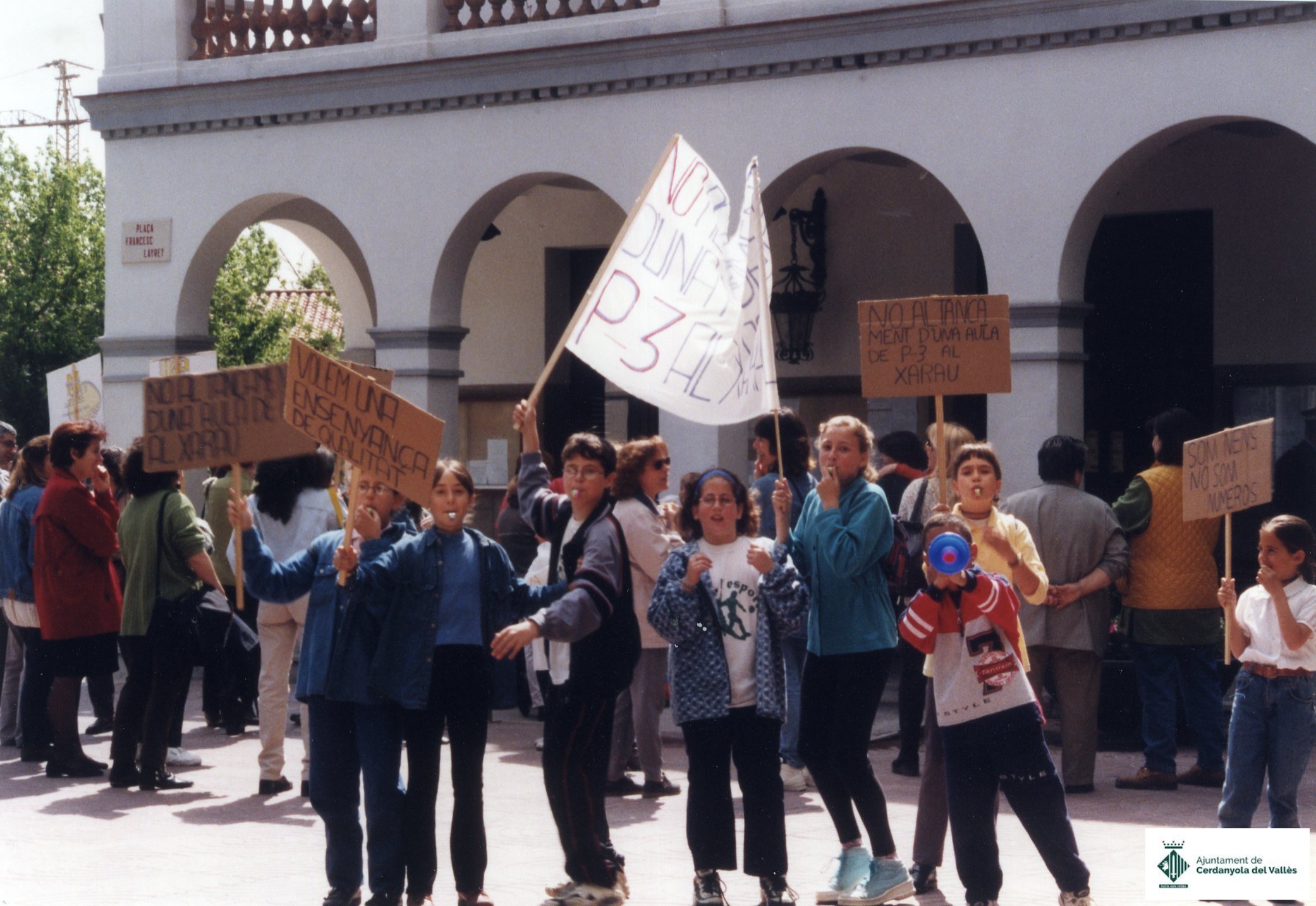 Alumnes de l'Escola Xarau es concentren davant l'Ajuntament de Cerdanyola del Vallès el maig de 1999 en protesta pel tancament d'un aula de P-3
