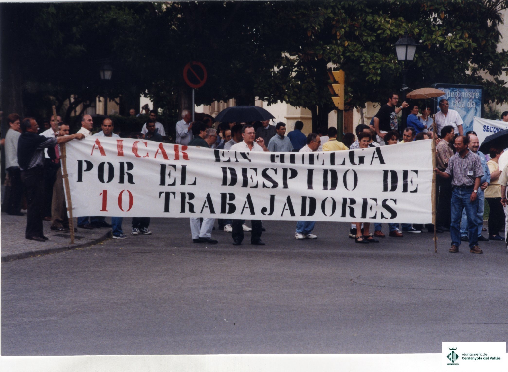 Concentració de personal i familiars de l'empresa AICAR davant l'Ajuntament de Cerdanyola del Vallès realitzada el juny de 1999 en protesta per l'acomiadament de 10 treballadors