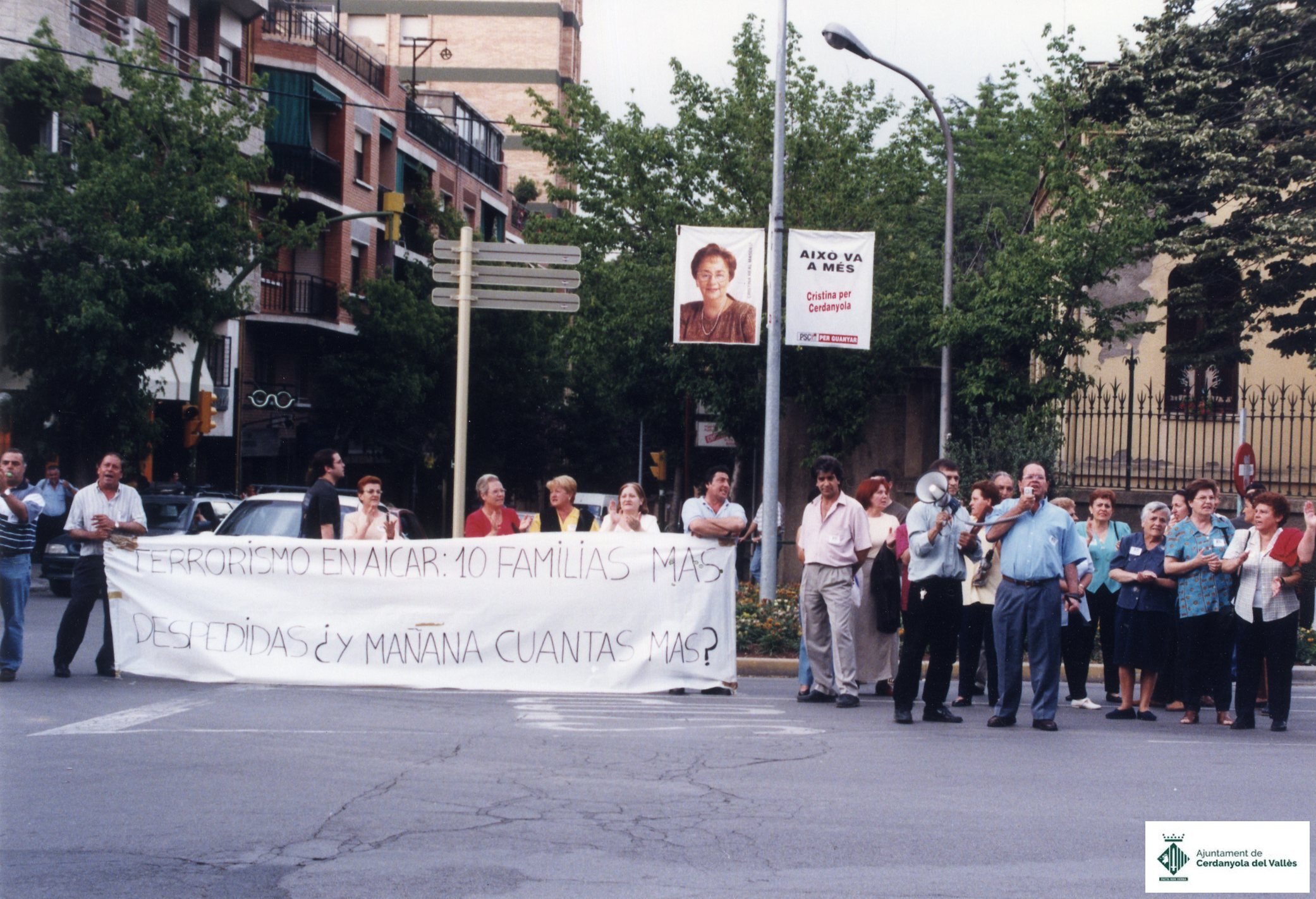 Concentració de personal i familiars de l'empresa AICAR davant l'Ajuntament de Cerdanyola del Vallès realitzada el juny de 1999 en protesta per l'acomiadament de 10 treballadors