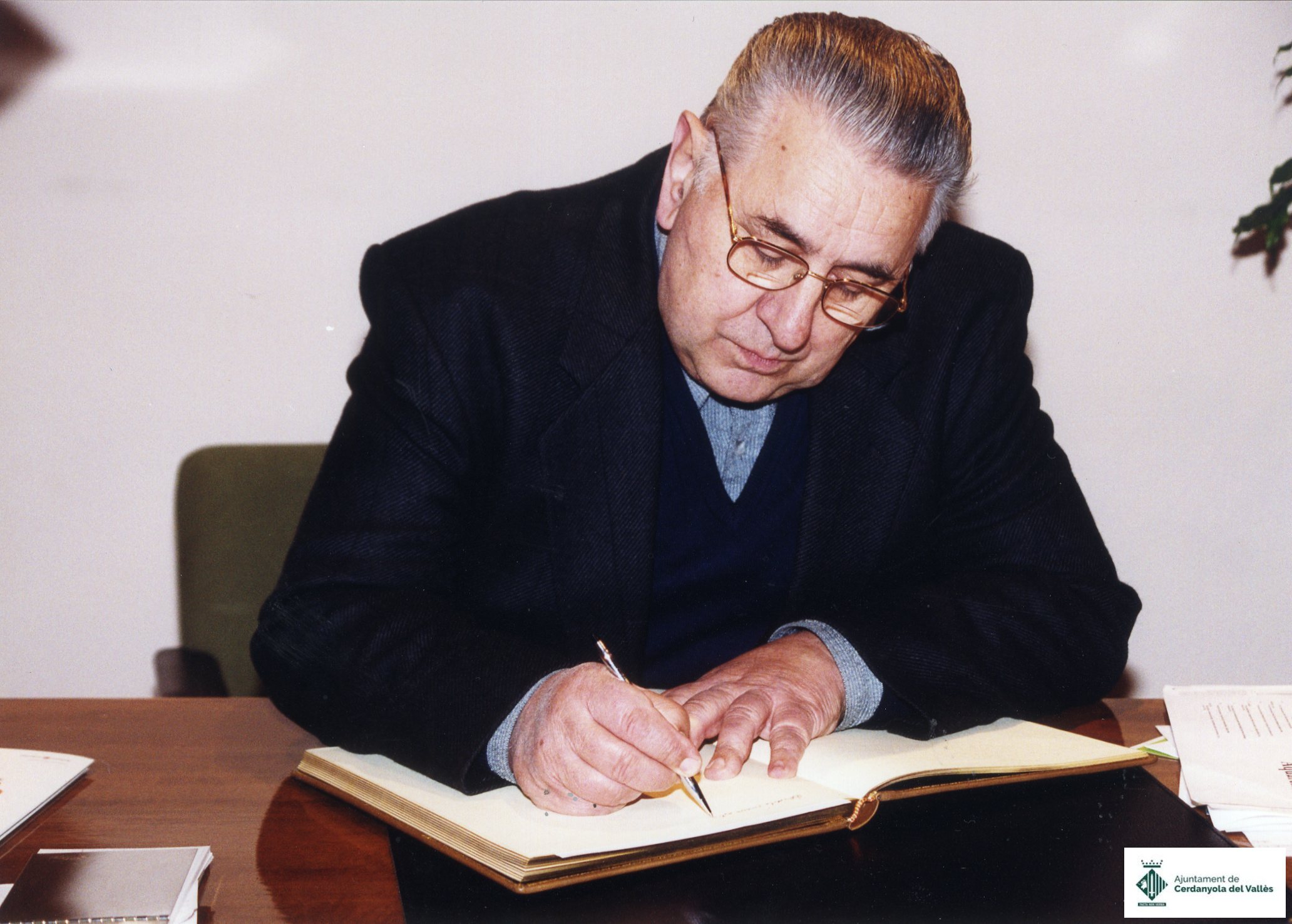 Acte de signatura del Llibre d'Honor de l'Ajuntament de Cerdanyola del Vallès de Mossèn Josep Rossell i Ramonet, rector de l'església de Sant Martí de Cerdanyola del Vallès, al despatx d'Alcaldia de l'Ajuntament de Cerdanyola del Vallès el novembre de 1999