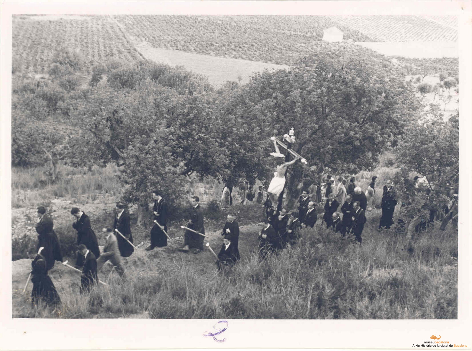 Via crucis a la creu de Montigalà en motiu del centenari de la Divina Providènca. Cos de portants de Santa Maria amb la creu (vista pujant la muntanya de Montigalà)
