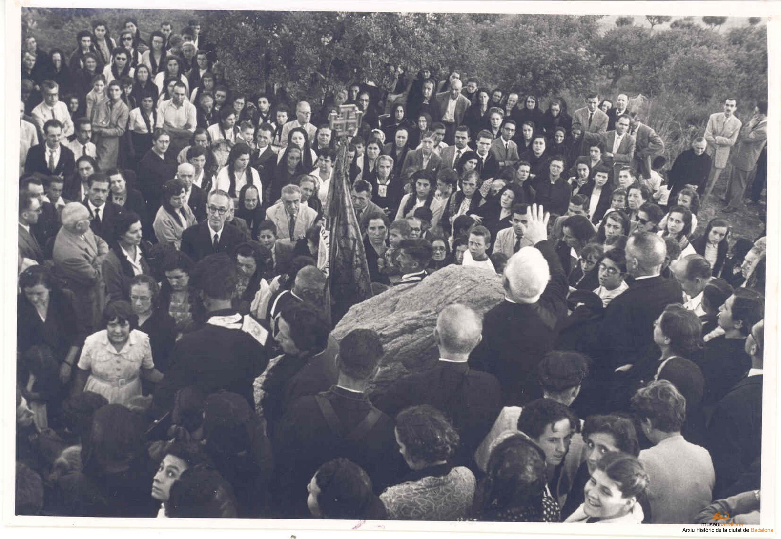 Via crucis a la creu de Montigalà en motiu del centenari de la Divina Providènca. El pare Artigas fent una plàtica