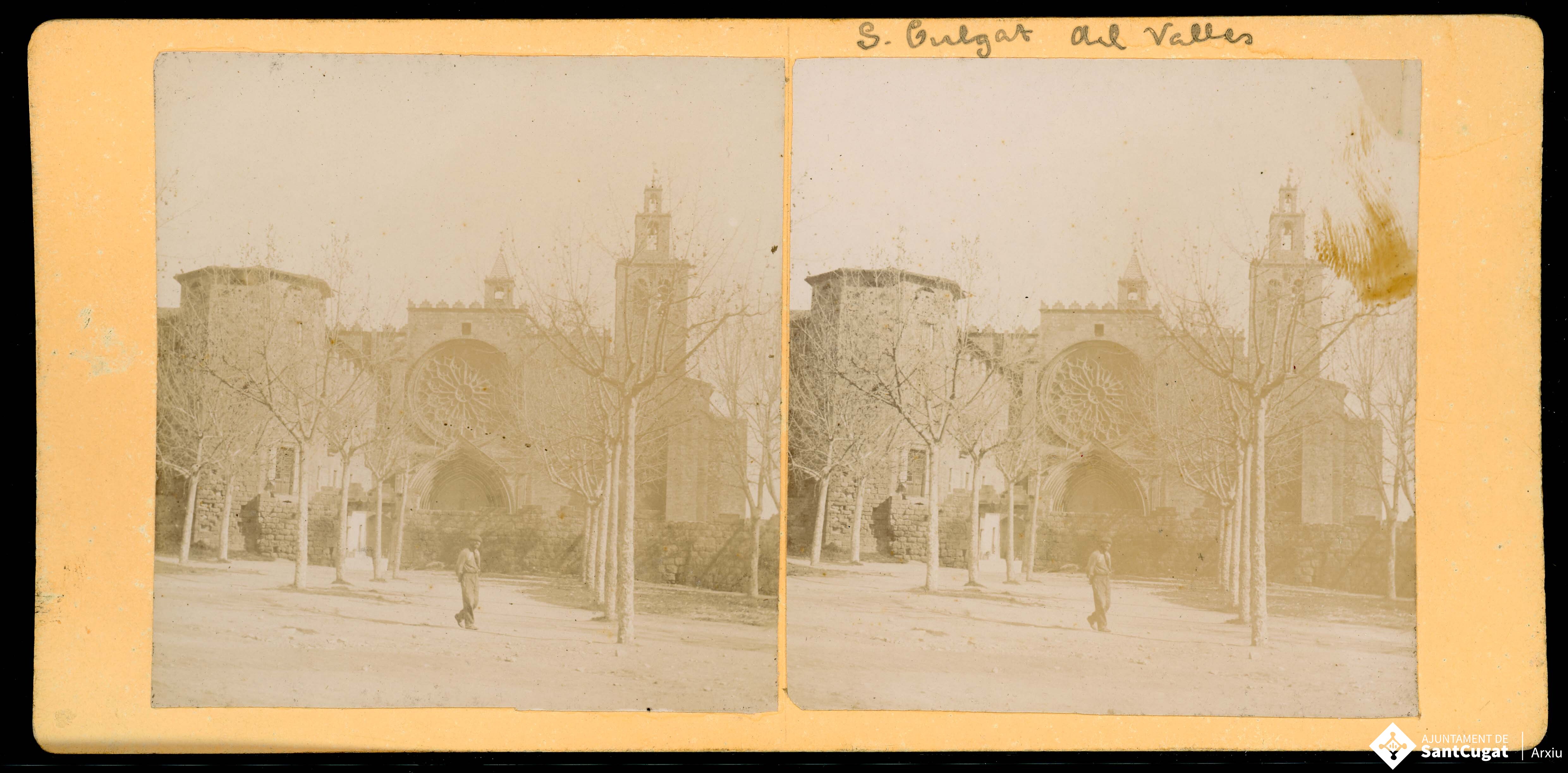 Còpia positiva estereoscòpica amb una vista de la plaça d'Octavià i el Monestir de Sant Cugat del Vallès. Totes dues albúmines estan sobre un suport secundari de cartó de color carabassa que té una anotació manuscrita amb el nom del municipi.