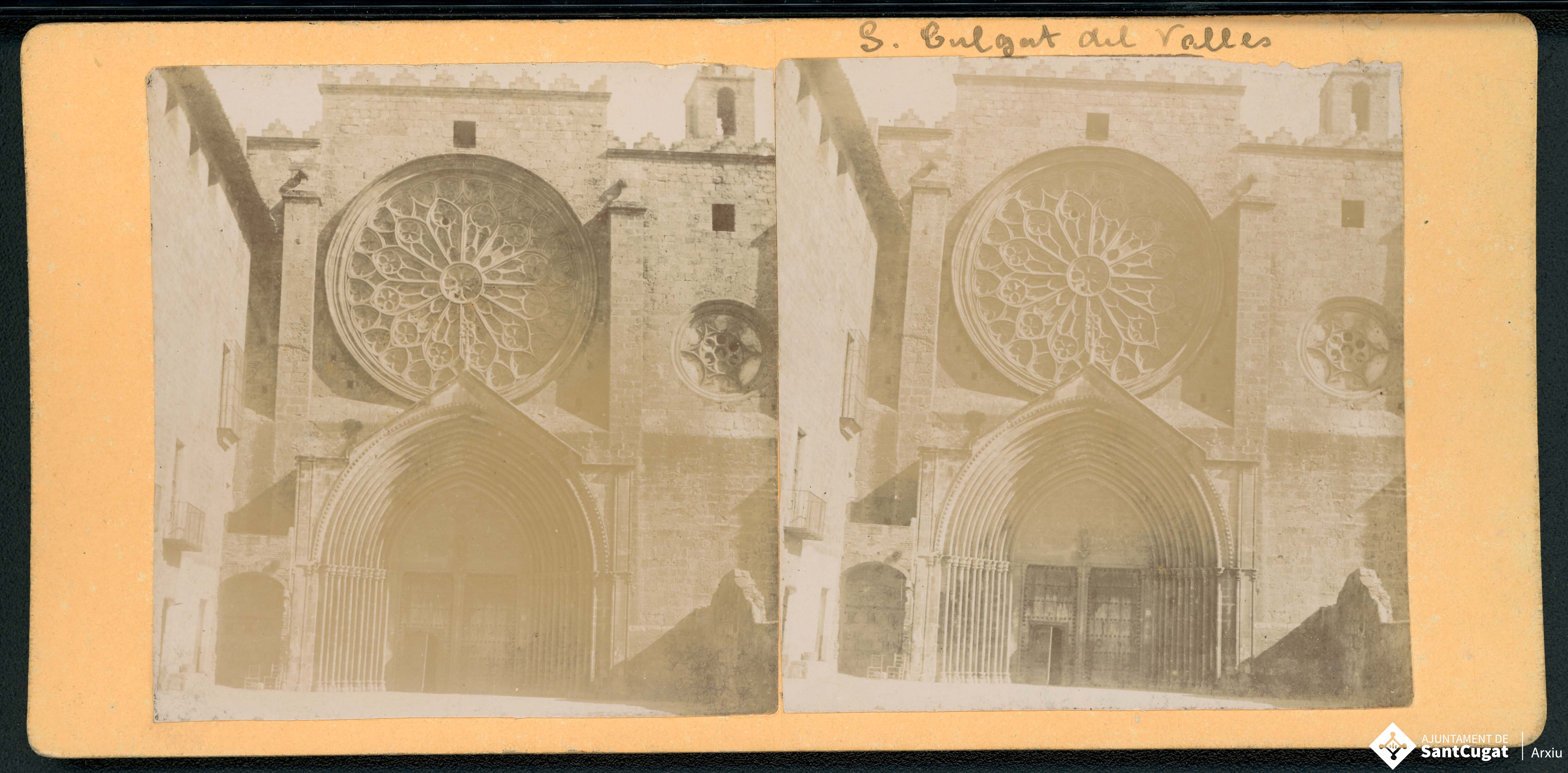 Còpia positiva estereoscòpica amb una vista de l'església de Sant Pere d'Octavià del Monestir de Sant Cugat del Vallès. Totes dues albúmines estan sobre un suport secundari de cartó de color carabassa que té una anotació manuscrita amb el nom del municipi.